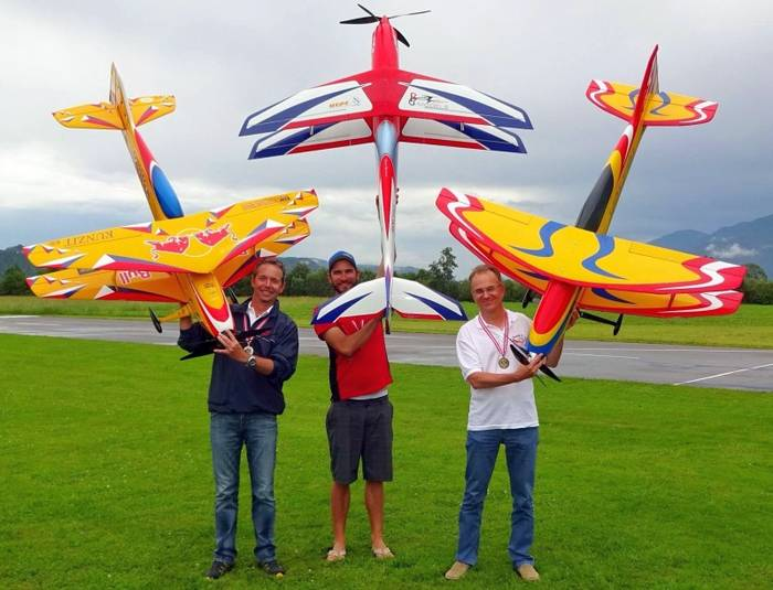 Die von allen Piloten ausgefüllte Techniktabelle lässt schon erkennen, welche Tendenzen sich in der F3A-Szene zeigen: Von den 13 Modellen waren 11 Doppeldecker, die sechs Koax-Antriebe sind alle in Doppeldeckern eingesetzt und finden sich unter den ersten sieben Plätzen wieder. Der Hacker Q80 ist dann die Alternative zum Koax-Antrieb. Alleine fünf Sensation sowie zwei Evolaris aus dem Hause Bruckmann zeigen den Einfluss auf die Szene in Österreich. Bei den Reglern gibt es praktisch nur Jeti-Pdorukte, die Spitze setzt komplett auf den Master Mezzon 95, die restlichen sind die bewährten Master Spin 99. Bemerkenswert ist, dass kein Pilot auf einen BEC-Regler setzt. Die meisten Modelle wiegen zwischen 4.500 – 5.000 g, einzig Gernot Bruckmann sticht mit einem sensationellen Abfluggewicht von 4.040 g heraus. Das erkennt man auch an seinem Flugstil, der extrem langsam ist. Bei den Akkus setzen sich die 4.150er von Hacker durch. Typisch für F3A-Modelle ist die hohe Anzahl an Flügen. Einzelne Modelle haben bis zu 1.500 Flüge absolviert und sehen immer noch aus wie neu. So sehr das Equipment bei den Modellen ähnlich ist und größtenteils aus dem Hause Hacker/Jeti stammt, so vielfältig geht es bei den Ladegeräten zu. Hier findet sich quasi jeder Anbieter wieder.