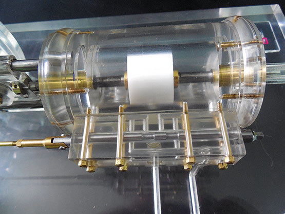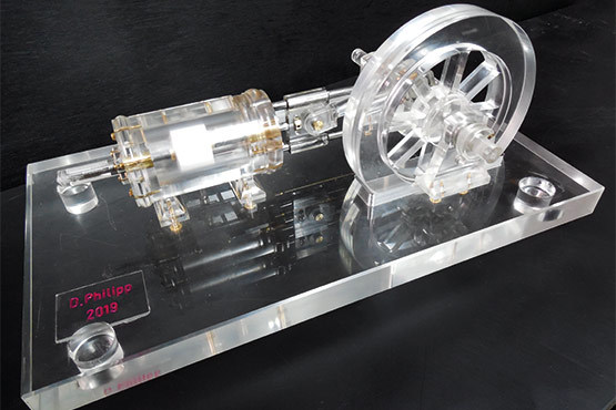 Um Zuschauern den Durchblick in die Funktionsweise einer Dampfmaschine zu bieten baute Dieter Philipp eine Maschine aus Plexiglas – wobei das Material einige Ansprüche stellte, die man von den ansonsten üblichen Metallen nicht kennt.