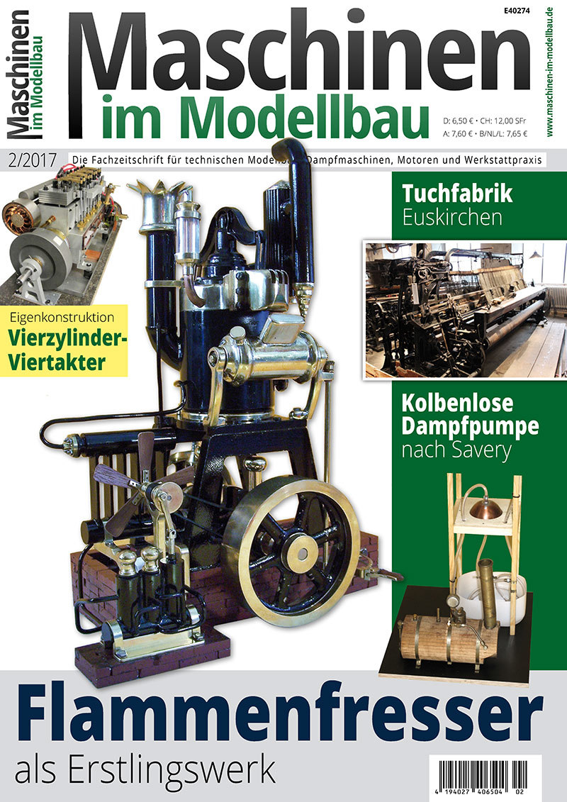 Sich als ersten Motoreigenbau an einen großen Flammenfresser zu wagen erfordert schon Mut. Thomas Lubjuhn hat dies getan und stellt seinen – zudem noch wunderschönen – Motor in der aktuellen MASCHINEN IM MODELLBAU vor. Ebenfalls eine Eigenkonstruktion ist der Viertakt-Vierzylinder von Martin Stalder. Der Motor ist nicht nur groß, sondern auch eine echte Augenweide, da der Konstrukteur darauf geachtet hat, alle möglichen beweglichen Teile sichtbar zu belassen. Ganz ohne bewegliche Teile kommt eine der ersten Dampfmaschinenkonstruktionen von Thomas Savery aus: der „Freund des Bergmanns“. Diese einfache, aber spannende Maschine hat Richard Reppisch entsprechend funktionsfähig in Szene gesetzt. Diese und viele weitere Themen finden sich in der MASCHINEN IM MODELLBAU 2/2017 – ab sofort digital erhältlich und ab dem 15.2.2017 im Zeitschriftenhandel!