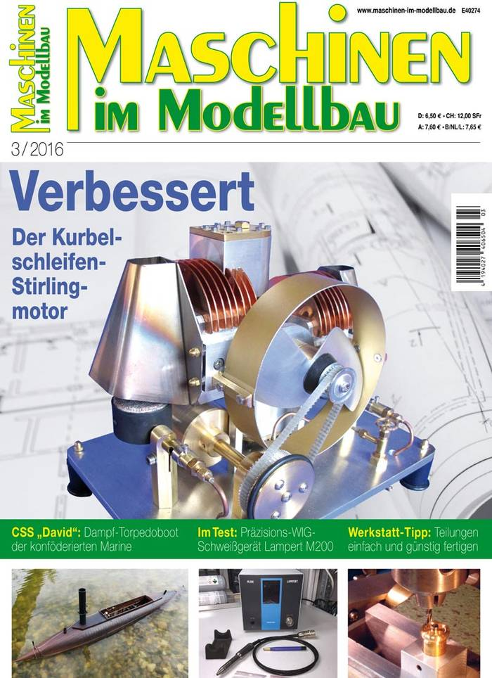 In der Ausgabe 2/2014 der MASCHINEN IM MODELLBAU hat unser Autor bereits das Konzept für den Bau eines 2-Zylinder-Kurbelschleifen-Stirlingmotors vorgestellt. Dieses Konzept mit seinen Vorteilen sollte beim Bau eines neuen Motors beibehalten, aber mit einigen Verbesserungen verwirklicht werden. Den großen Baubericht lesen Sie in der neuen MASCHINEN IM MODELLBAU 03/2016. Weiterhin hat Stefan Haisch in einem Test das WIG-Schweißgerät M200 von Lampert unter die Lupe genommen, Thomas Hillenbrand porträtiert sein ungewöhnliches Südstaaten-Dampfschiff „CSS David“ und Rémy Hecht erklärt, wie einfache und kostengünstige Teilungen funktionieren. Diese und viele weitere Themen gibt es in der MASCHINEN IM MODELLBAU 03/2016 – ab sofort digital erhältlich und ab 14.4.2016 im Zeitschriftenhandel.