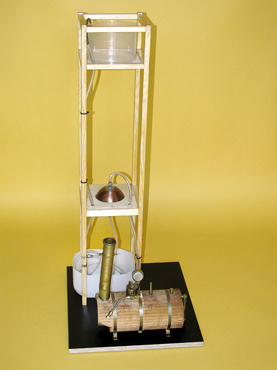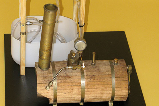 Gerade die Anfangszeit der Dampfmaschinen war von den vielfältigsten Ideen und Konstruktionen geprägt. Eine war die kolbenlose Dampfpumpe von Thomas Savery, die in Bergwerken das nachströmende Wasser herauspumpen sollte. Richard Reppisch hat diese – vom Wirkungsgrad her sehr unbefriedigende – Konstruktion als funktionsfähiges Modell nachgebaut.