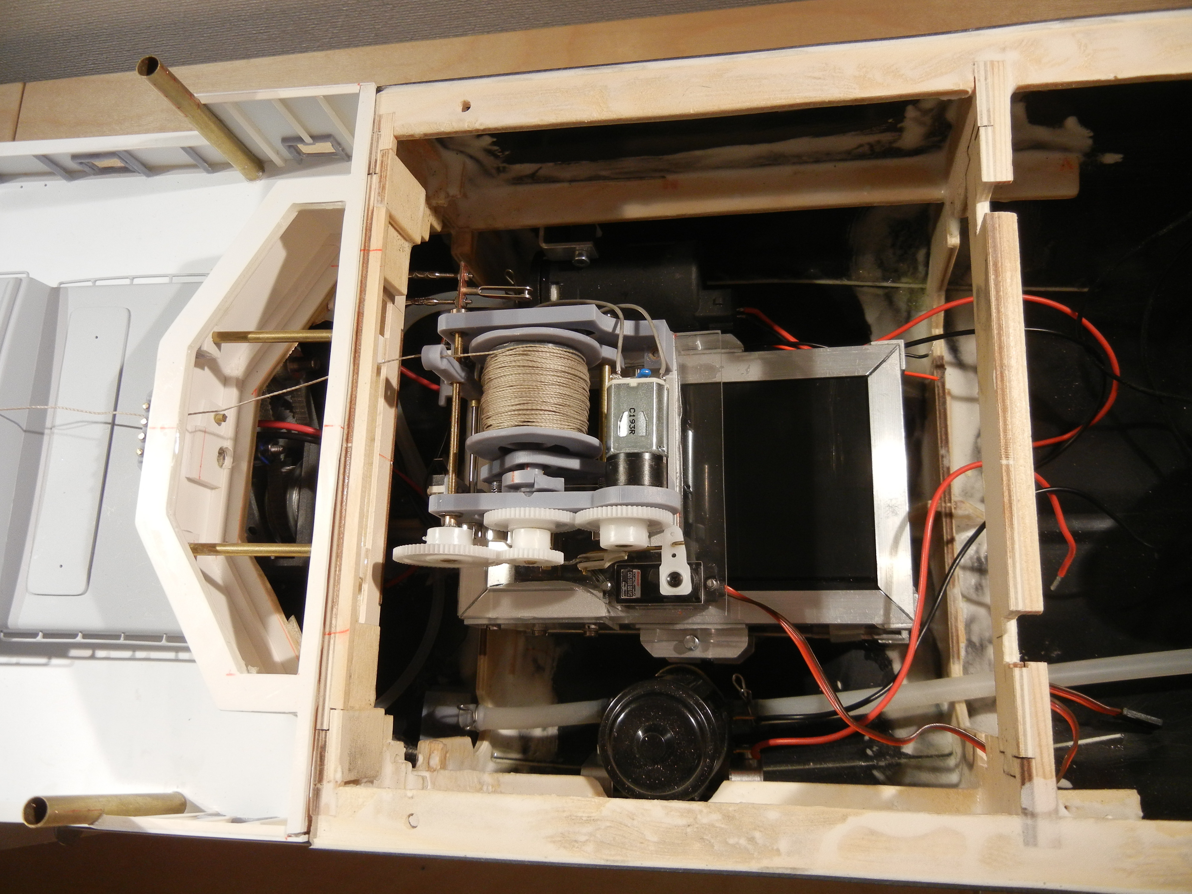Die beiden Löschmonitore sind mit Hilfe der optionalen Wasserpumpe 7003/90 funktionsfähig und liegen dem Bausatz bei, ebenso die benötigten Kupplungen und Anschlüsse für die Schlauchführungen. Das Spantgerüst im Rumpf sieht den Einbau der Wasserpumpe bereits vor und die ausführlich gestaltete Bauanleitung zeigt genau deren Einbau und Anschluß.