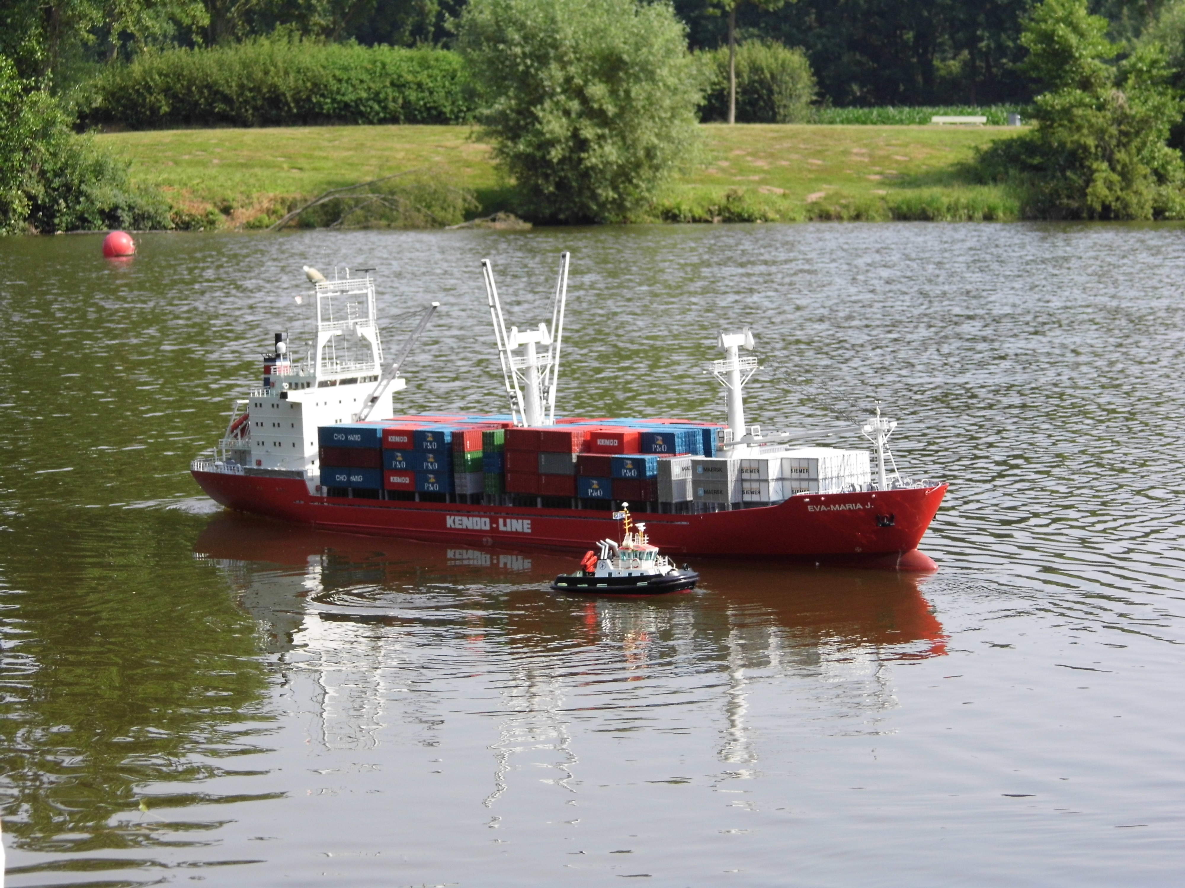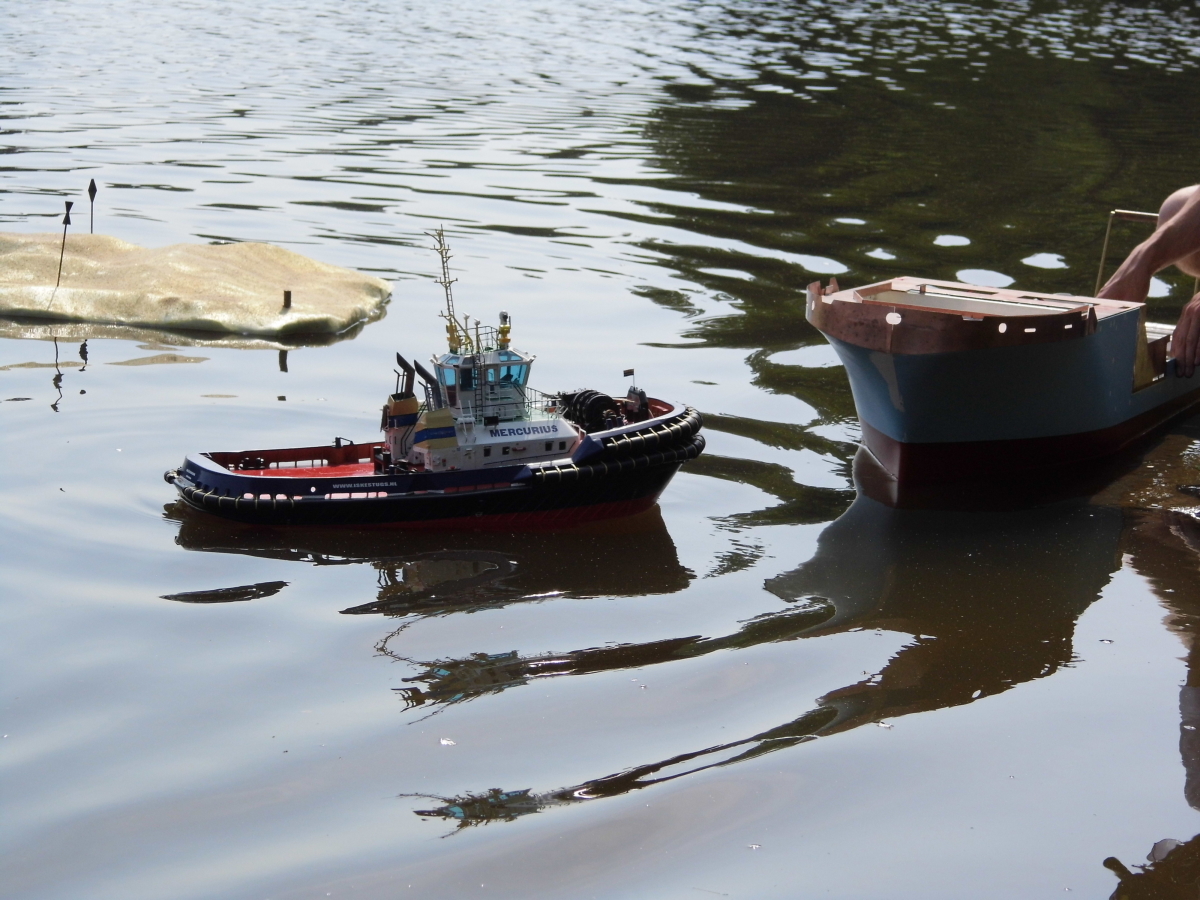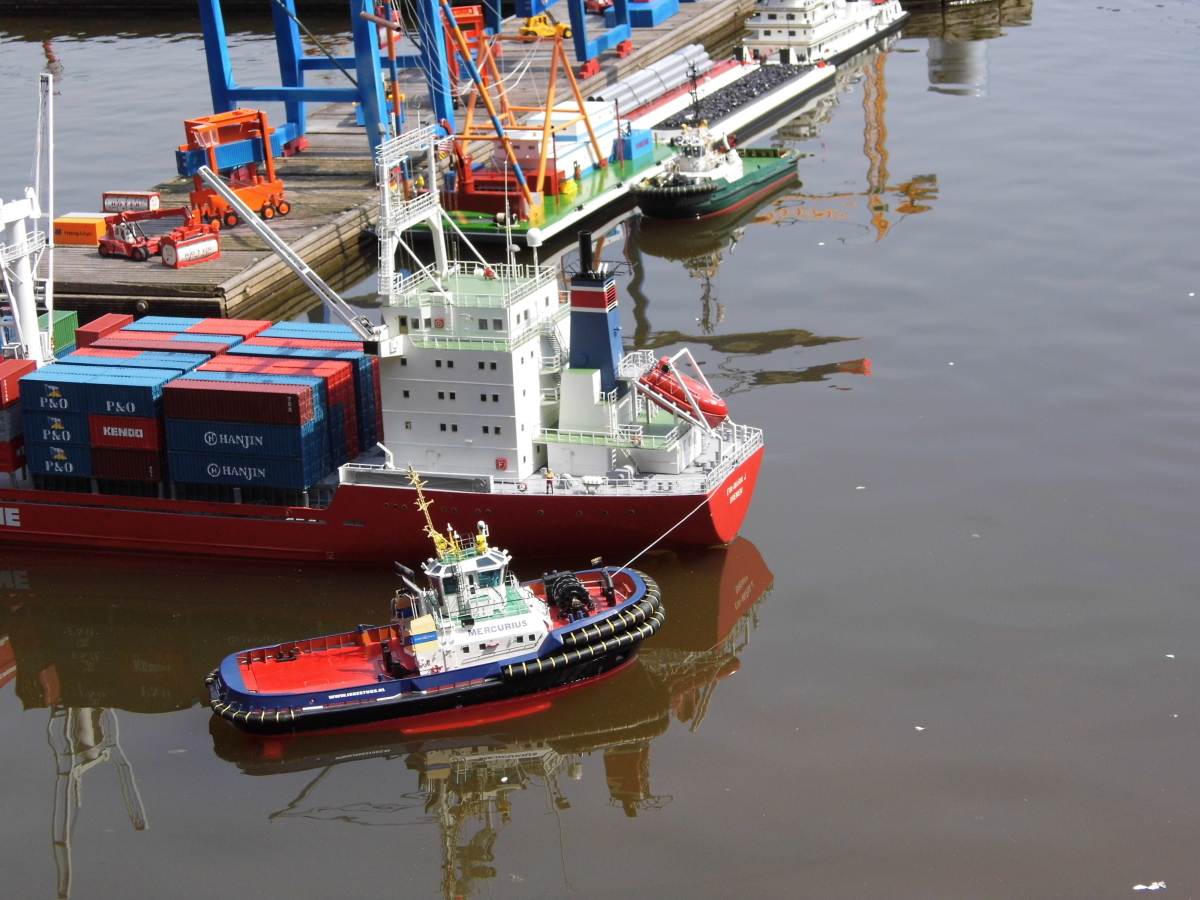 Da aber fast alle früher kamen, war der Hafen um 10 Uhr schon voller fahrender, bugsierender und schleppender Schiffe. Kümos, Schlepper, Eisbrecher usw. fuhren ihre erste Runden. Toll, das wollten wir! Fast jeder, dem nicht zu heiß war, saß am Steg und fuhr mit seinem Modell oder redete mit den Kollegen. Schön ist immer, wenn während des ganzen Tages der Hafen stark besucht wird und nie Stillstand herrscht. Schuten mussten umgekoppelt werden und gingen wieder raus oder in andere Hafenbecken. Das Containerschiff wurde mit zwei Schleppern an die Pier gebracht und nach Löschen der Ladung wieder mit zwei anderen Schleppern raus auf See gebracht. Ständig war Bewegung im Hafen. Der Lotse flitzte stetig von Aufkommern zu Abgängern und kam kaum hinterher. Wir hatten sogar einen Fährbetrieb eingerichtet. Der SMC Ibbenbüren hatte uns wieder für den Tag den Hafen geliehen und war selbst mit seinen Kapitänen vertreten, die sich nicht nur um ihre Modelle, die Gäste und den Hafen kümmerten, sondern auch noch eine Wurst / ein Steak für alle gegrillt haben. Es gab ausserdem noch Kaffee und Kuchen. Die gute Laune war mit der Mahlzeit gesichert!