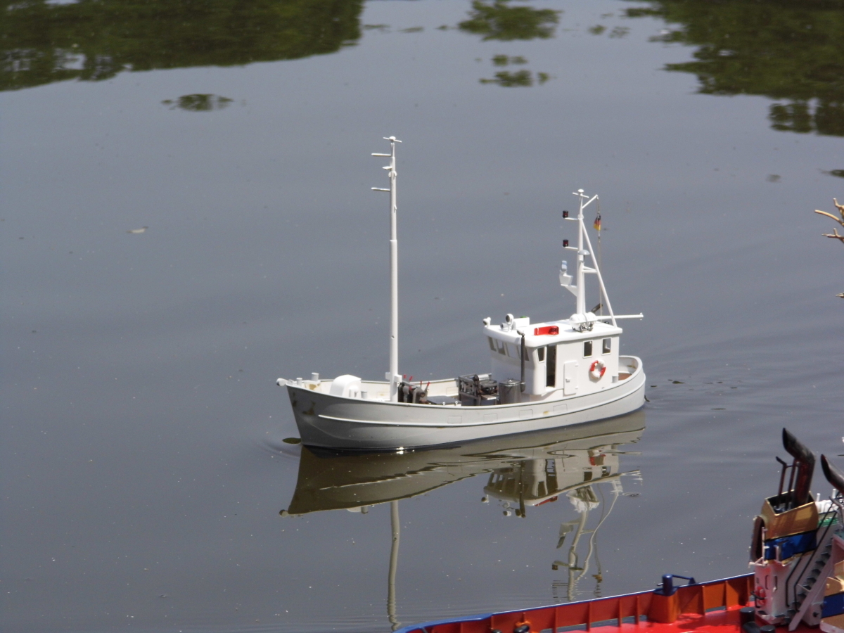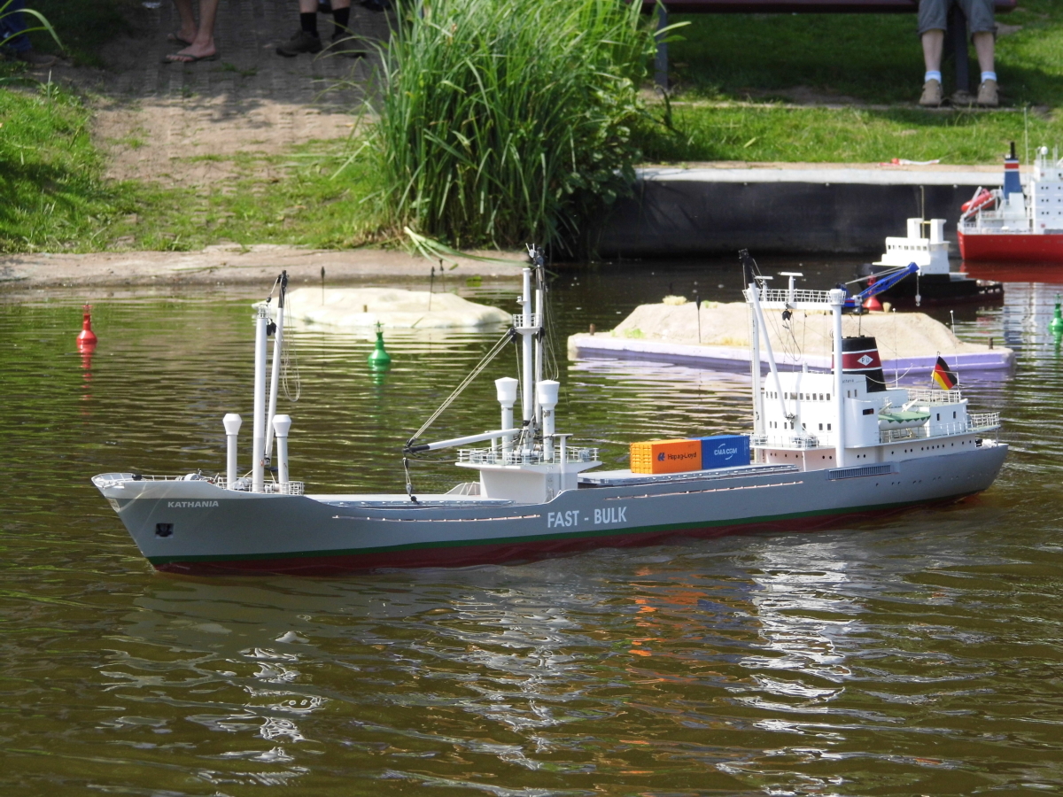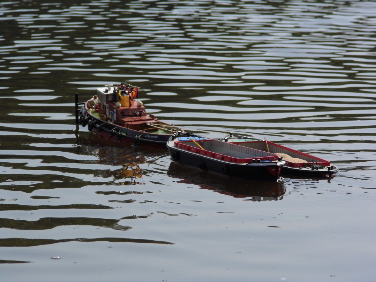 Da aber fast alle früher kamen, war der Hafen um 10 Uhr schon voller fahrender, bugsierender und schleppender Schiffe. Kümos, Schlepper, Eisbrecher usw. fuhren ihre erste Runden. Toll, das wollten wir! Fast jeder, dem nicht zu heiß war, saß am Steg und fuhr mit seinem Modell oder redete mit den Kollegen. Schön ist immer, wenn während des ganzen Tages der Hafen stark besucht wird und nie Stillstand herrscht. Schuten mussten umgekoppelt werden und gingen wieder raus oder in andere Hafenbecken. Das Containerschiff wurde mit zwei Schleppern an die Pier gebracht und nach Löschen der Ladung wieder mit zwei anderen Schleppern raus auf See gebracht. Ständig war Bewegung im Hafen. Der Lotse flitzte stetig von Aufkommern zu Abgängern und kam kaum hinterher. Wir hatten sogar einen Fährbetrieb eingerichtet. Der SMC Ibbenbüren hatte uns wieder für den Tag den Hafen geliehen und war selbst mit seinen Kapitänen vertreten, die sich nicht nur um ihre Modelle, die Gäste und den Hafen kümmerten, sondern auch noch eine Wurst / ein Steak für alle gegrillt haben. Es gab ausserdem noch Kaffee und Kuchen. Die gute Laune war mit der Mahlzeit gesichert!