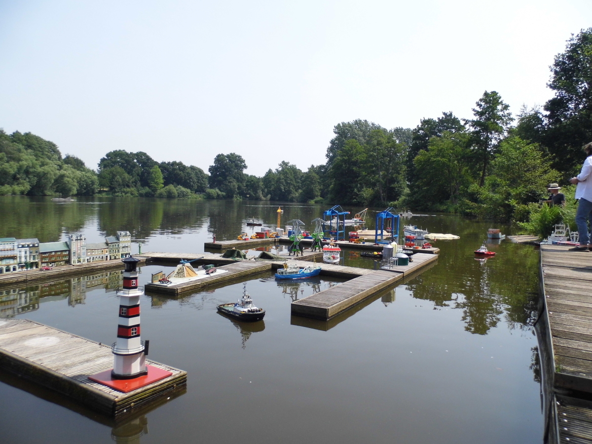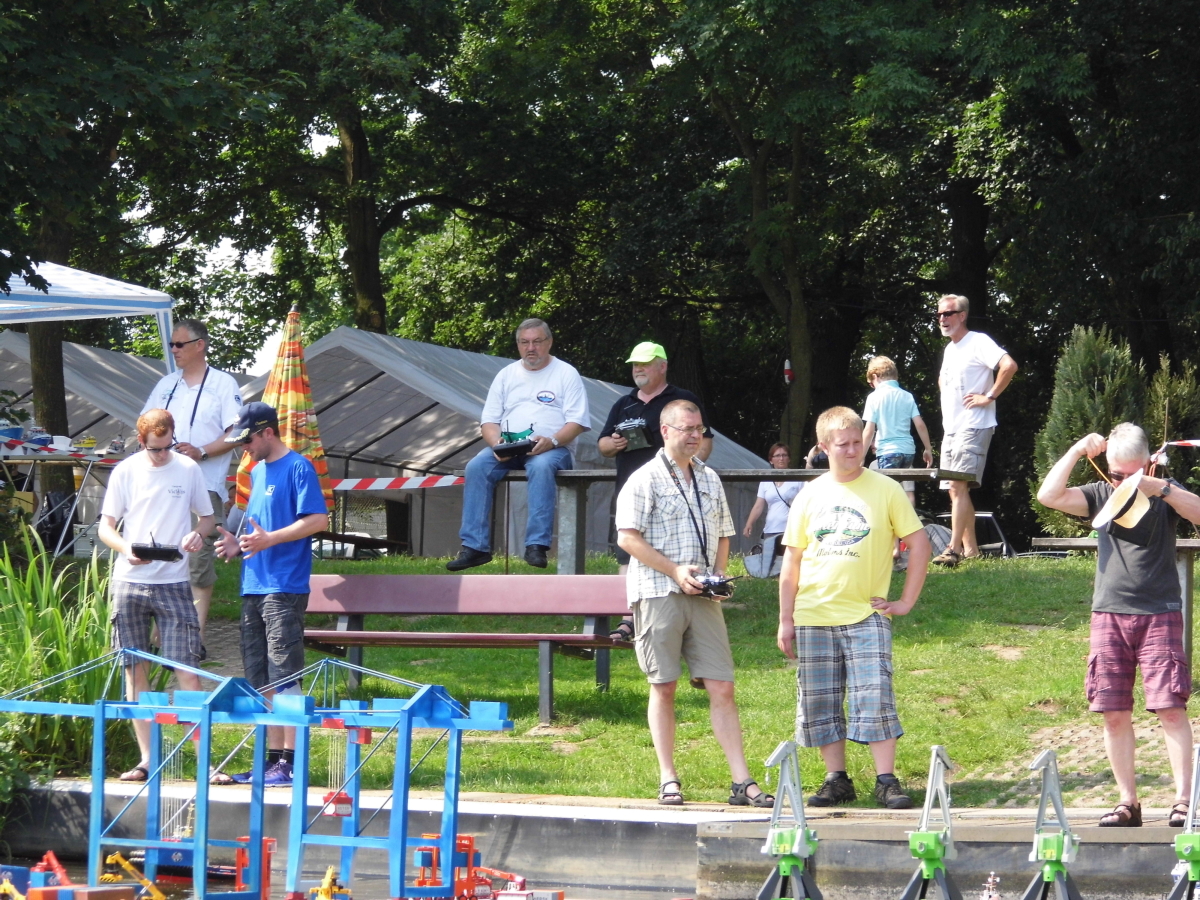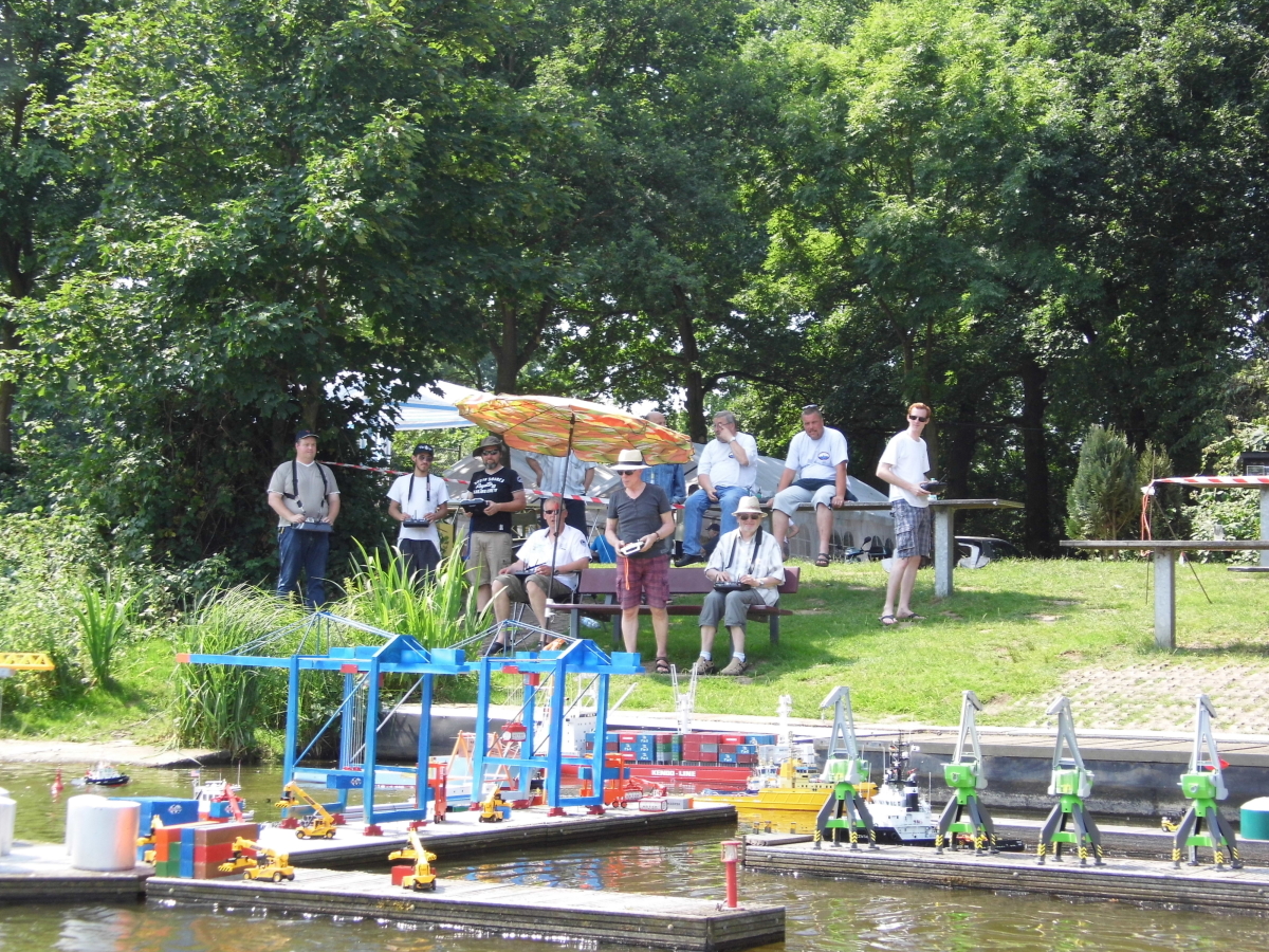 Da der Termin schon im Februar feststand, konnten auch Gäste von weiter her mitmachen und Ihre persönlichen Termine so legen, dass das Treffen in den jeweiligen Jahresplan passte. Da es wie die Jahre zuvor vom SMC Ibbenbüren ausgerichtet wurde, waren Örtlichkeit und Versorgung gesichert. Zelte, Strom und Hafen stellten die Ibbenbürener gern zur Verfügung. Ich brauchte nur einige Mails an die Kapitäne der letzten Veranstaltungen senden sowie eine Einladung bei Facebook und in ein niederländisches Modellbauforum stellen. Mehr war nicht nötig! Ungefähr 4 Wochen vor der Veranstalltung wussten wir, wer so kommt und was wir an Modellen zu erwarten hatten. Was ich nicht wusste war, dass am Tag des Treffens satte 40 Grad plus erwartet wurden und das leider einige Modellbauer abschreckte zu kommen. Da der Verein aus dem Platzmangel der Vorjahre gelernt hatte, fand diesmal jeder Platz. Auch weil einige der Kollegen ihre Fahrmodell im Hafen parkten. Um 10 Uhr sollte es losgehen.
