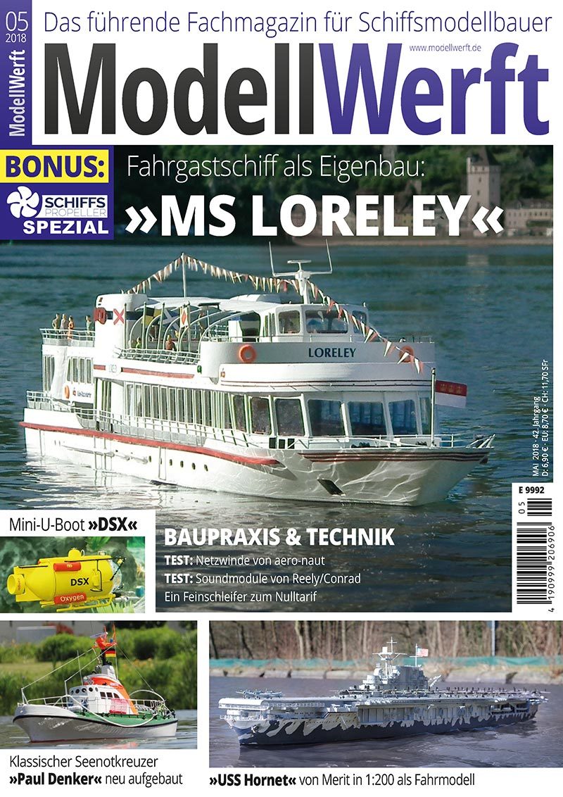 In der neuen MODELLWERFT stellen wir Ihnen in unserem SCHIFFSPROPELLER-Spezial wieder zwei außergewöhnliche Eigenbau-Modelle vor, die auf den heimischen Modellgewässern eher selten anzutreffen sind. Den Anfang macht das Mini-U-Boot Deep Sea Explorer DSX von Thorsten Feuchter, ein kleines Wunderwerk der Mikro-Modelltechnik. Die gerade mal 10 cm lange DSX im Maßstab 1:87 ist mit einem Tauchtank versehen, der es ermöglicht, das Forschungstauchboot millimetergenau im Tauchgewässer zu positionieren. Die DSX wurde u. a. mit verschiedenen Beleuchtungsfunktionen und einem Saugrohr ausgestattet. Der große Baubericht wird abgerundet durch faszinierende Unterwasseraufnahmen, die im weltberühmten Hamburger Miniatur Wunderland aufgenommen wurden. Das Modell des modernen Rhein-Fahrgastschiffes MS Loreley im Maßstab 1:50 von Joachim Brehm hingegen ist ein wahrer Augenschmaus in Weiß. Das Modell wurde mit einer einmaligen Unterwasserbeleuchtung ausgestattet, die nachts besonders gut zur Geltung kommt. Der Erbauer legte ebenfalls großen Wert auf die Inneneinrichtung – deshalb befinden sich im großen Ballsaal sogar ferngesteuerte Tanzgäste, die auf dem Parkett Ihre Runden drehen.