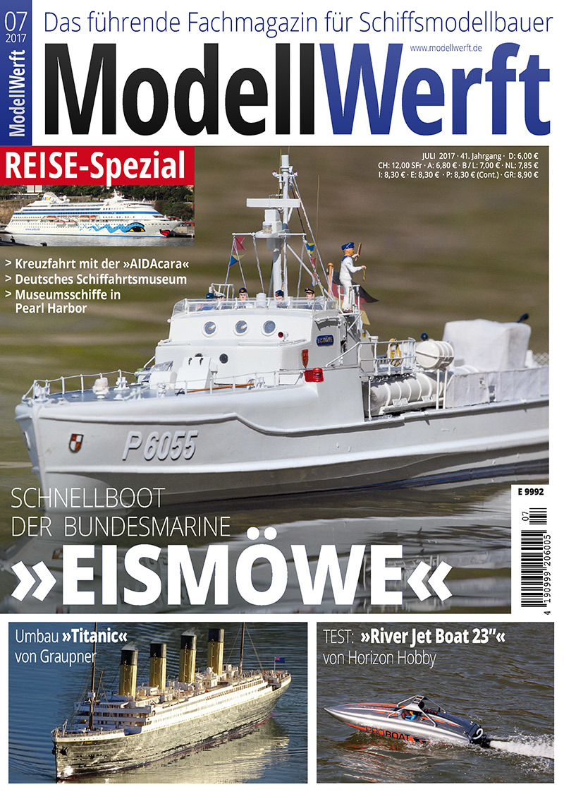 In der MODELLWERFT 07/2017 nehmen wir Sie in unserem großen Reise-Spezial ab Seite 46 mit auf eine Tour rund um die Welt. Der erste Stopp ist beim Deutschen Schiffahrtsmuseum in Bremerhaven, wo wir uns die zahlreichen und eindrucksvollen Schiffsmodelle sowie die Originalschiffe genauer ansehen. Danach geht es weiter auf den Atlantik, wo wir von Bord des Kreuzfahrtschiffes AIDAcara berichten, das auf der Route Gran Canaria-Madeira-Lissabon-Hamburg unterwegs ist. Im Anschluss landen wir im US-Bundesstaat Hawaii und besichtigen die dortigen erhaltenen Museumsschiffe, darunter die berühmte USS Missouri, auf deren Oberdeck am 02. September 1945 der Zweite Weltkrieg sein Ende fand.