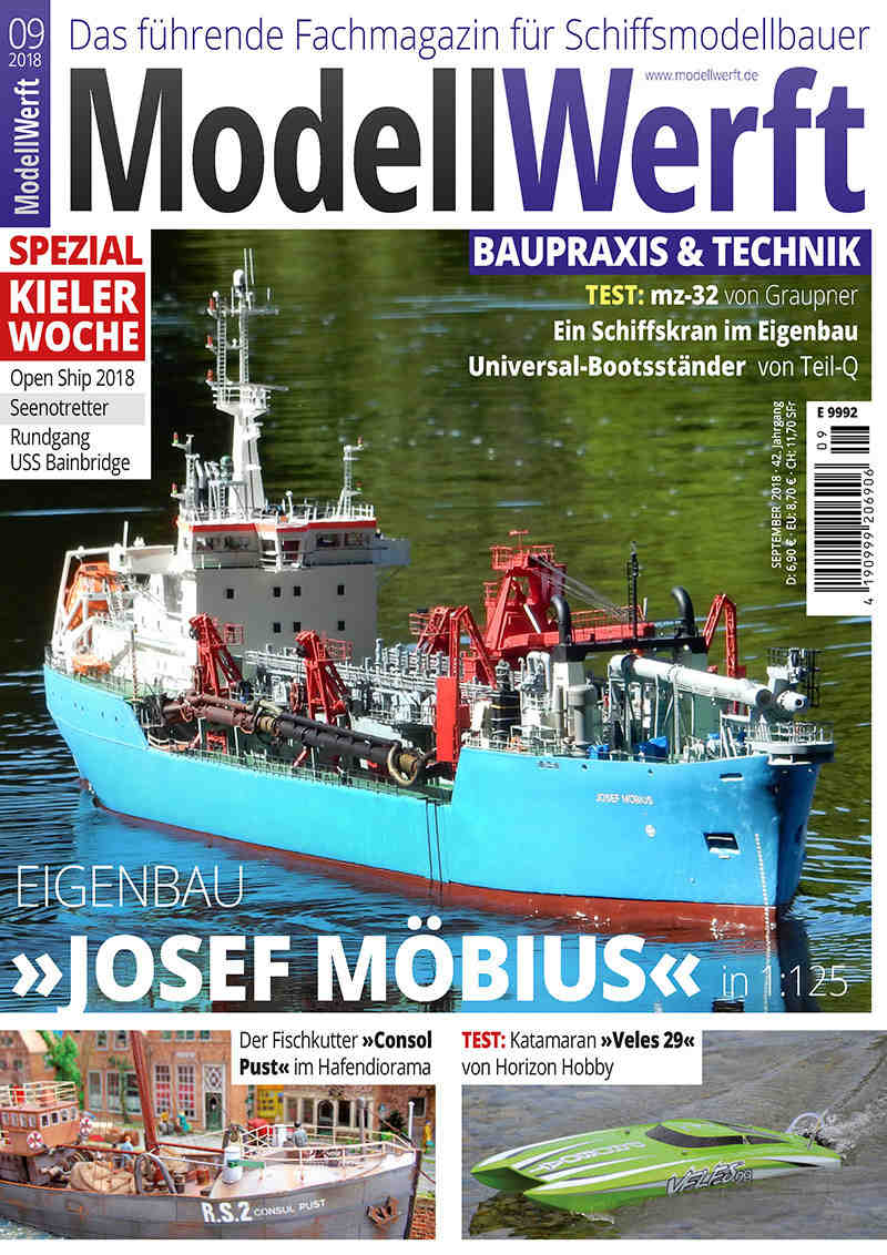 Weitere Highlights: Das 5. Marine-Modell-Flottentreffen in Gelsenkirchen, Eigenbau portugiesische Karavelle Sao Jao, TEST: Veles 29 von Horizon Hobby, das Open Ship 2018 auf der Kieler Woche, das Kartonmodell Consol Pust in einem Hafendiorama, TEST: mz-32 von Graupner, Eigenbau eines funktionsfähigen Krans, Die Seenotretter auf der Kieler Woche, die Hamburger Eisbrecher.