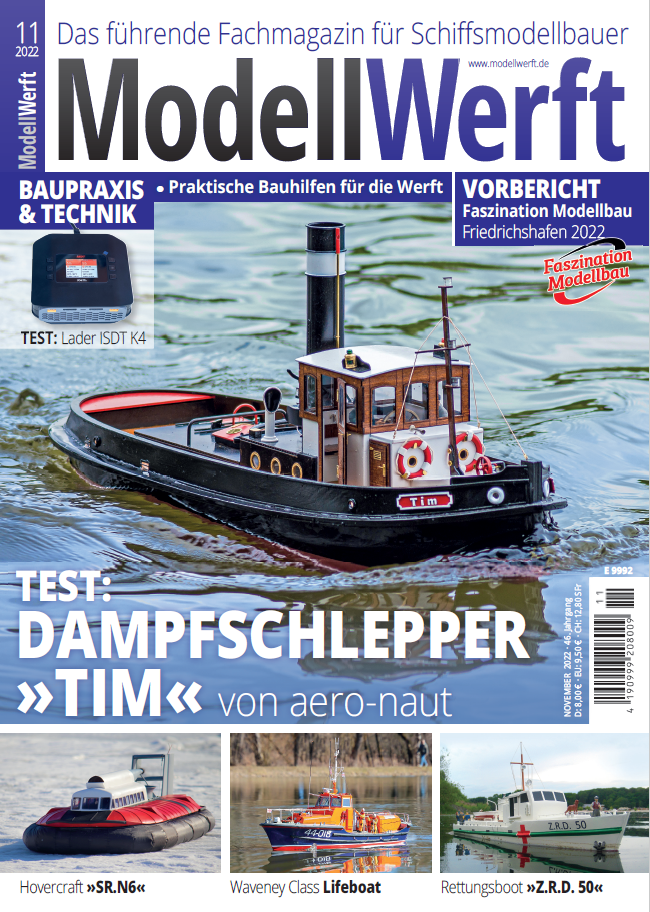 Mit dem Dampfschlepper-Modell Tim hat aero-naut Modellbau Mitte des Jahres einen weiteren hochwertigen Baukasten ins Produktsortiment aufgenommen. MODELLWERFT-Autor Christian Kamp testet in der aktuellen MODELLWERFT-Ausgabe 11/2022 exklusiv den neuen Baukasten von aero-naut Modellbau. Fachlich fundiert und mit vielen Detail-Aufnahmen berichtet er von seinem Testmodell – von der ersten Sichtung bis hin zur Jungfernfahrt. Zusätzlich gibt er praktische Tipps, wie der Schlepper mit weiteren Highlights ergänzt und optimiert werden kann.