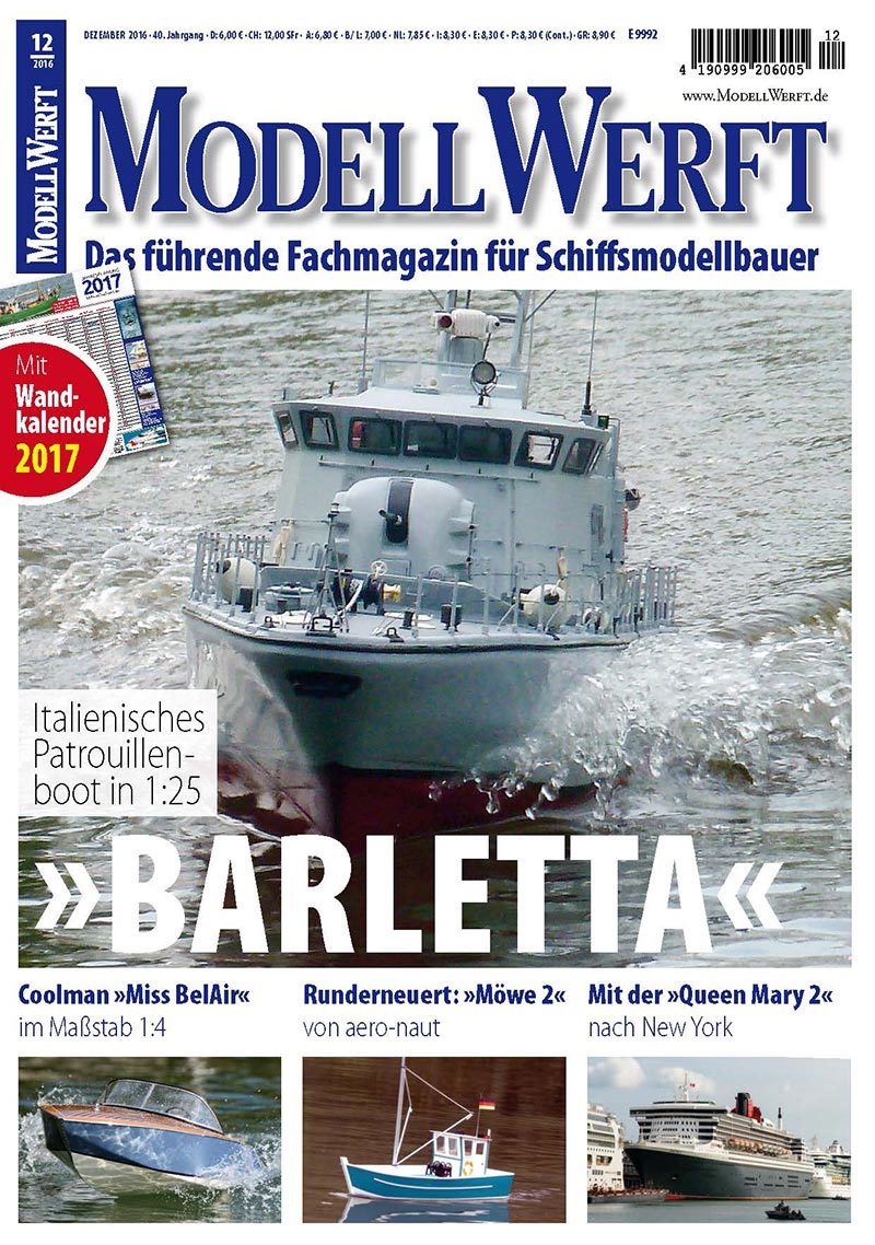 Die Patrouillenboote der italienischen Guardia di Finanza sind in unseren Breiten eher unbekannt. Grund genug für ModellWerft-Autor Oliver Müller, sich mit dem Eigenbau eines Bootes der Bigliani-Klasse von 1981 im Maßstab 1:25 zu befassen, er stellt seine Barletta in der ModellWerft 12/2016 vor. Ebenfalls eine wahres Schmuckstück ist die Coolman Miss BelAir im Maßstab 1:4, die Gernot Kreutzer aus einem Spantensatz von Rainer Kuhlmann für den Bau eines Prototypen überaus detailreich fertigte. Weiterhin entführt uns Roman Graf mit der CT10 in die spannende Welt der Turbinen-Hydroplane und Beat Wirthmüller berichtet in einer Reportage von seiner Überfahrt nach New York mit dem jetzt schon legendären Oceanliner Queen Mary 2. Diese und viele weitere Themen gibt es in der ModellWerft 12/2016 – ab sofort digital erhältlich und ab 15. November 2016 im Zeitschriftenhandel. In der Printausgabe finden Sie zusätzlich einen großen Wandkalender für das Jahr 2017.