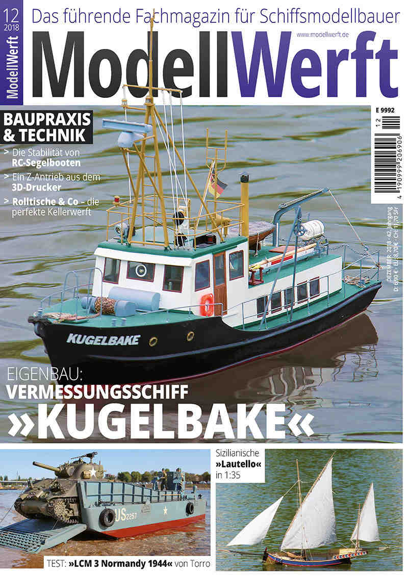 Das Titelmodell der neuen MODELLWERFT ist das Vermessungsschiff Kugelbake, das zu den VTH-Klassikern zählt, denn die erste Fotoreportage von Bord des Originalschiffes erschien bereits im März 1980 in der MODELLWERFT. Matthias Schumacher war schon damals von dem nur 16 m langen Arbeitsschiff des Wasser- und Schifffahrtsamtes begeistert. Im Jahr 1984 entschied sich für einen Nachbau im Maßstab 1:30, in dem er sein Modell mit vielen tollen Detaillösungen ausstatten konnte. Nach einer modellbauerischen Schaffenspause von mehr als 20 Jahren wurde die Kugelbake von Matthias vollständig neu aufgebaut und komplettiert. Das Ergebnis ist ein überaus detailliertes Fahrmodell, das mit 58 cm Länge noch transportfreundlich ist und mittlerweile auf vielen Gewässern in Europa zum Einsatz gekommen ist.