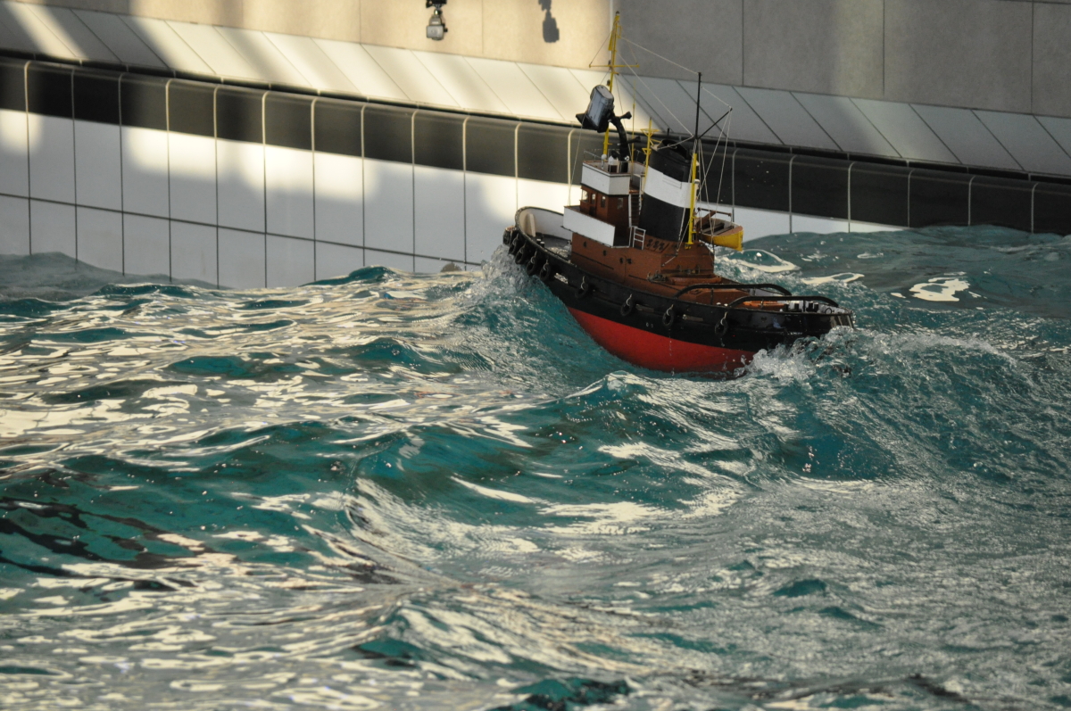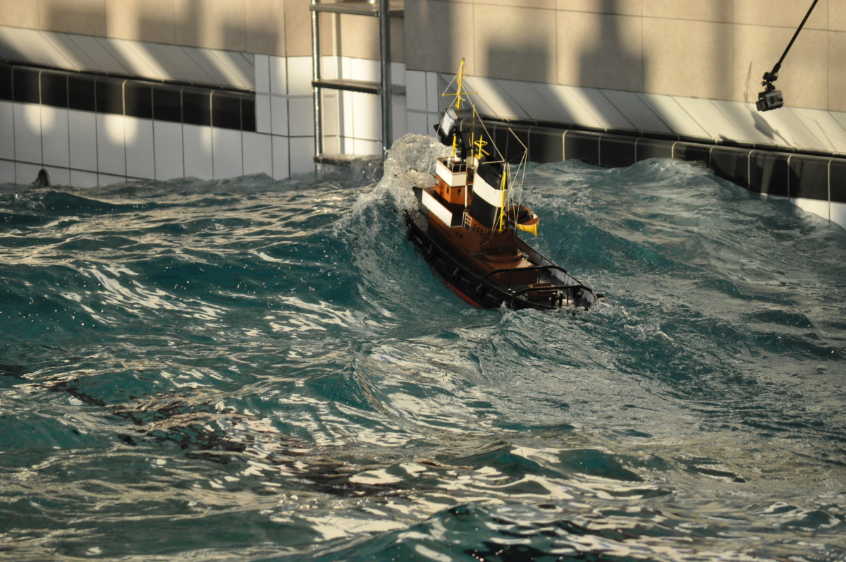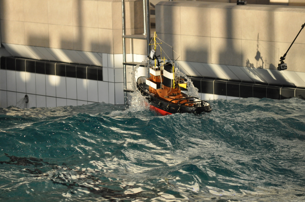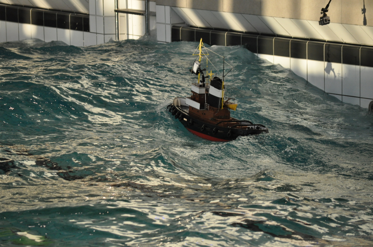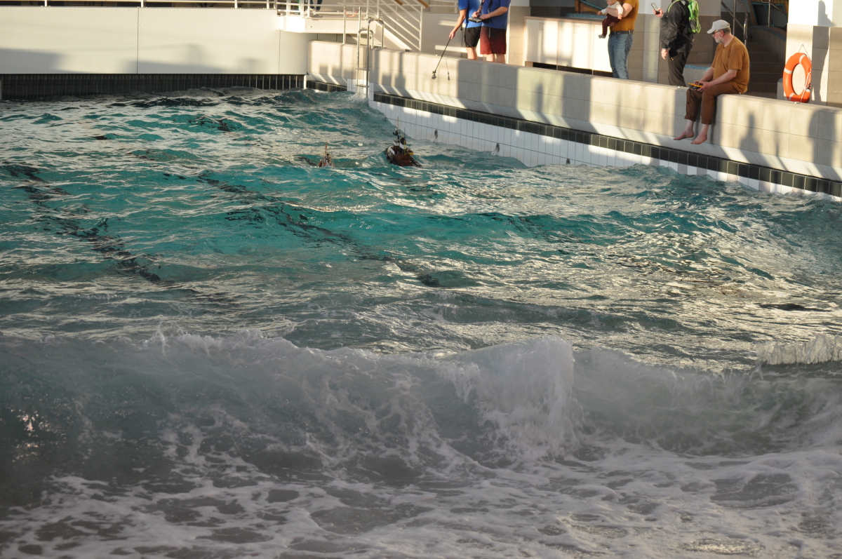 Zu jeder halben Stunde wurde im großen Meerwasserbecken die Wellenmaschine gestartet und das sonst ruhige Wasser wandelte sich binnen Sekunden zu schwerem Seegang. Unter den Augen zahlreicher begeisterter Zuschauer kämpften sich die Schiffsmodelle durch die auf den Maßstab gerechneten Monsterwellen. Dabei mussten die Kapitäne genau wissen, was sie ihren Modellen zumuten konnten. Würde man falsch navigieren, könnte das zum Kentern oder sogar zum Untergang des Schiffes führen. An diesem Tag allerdings lief alles glatt und kein Schiff kam durch die schwere See zu Schaden.
