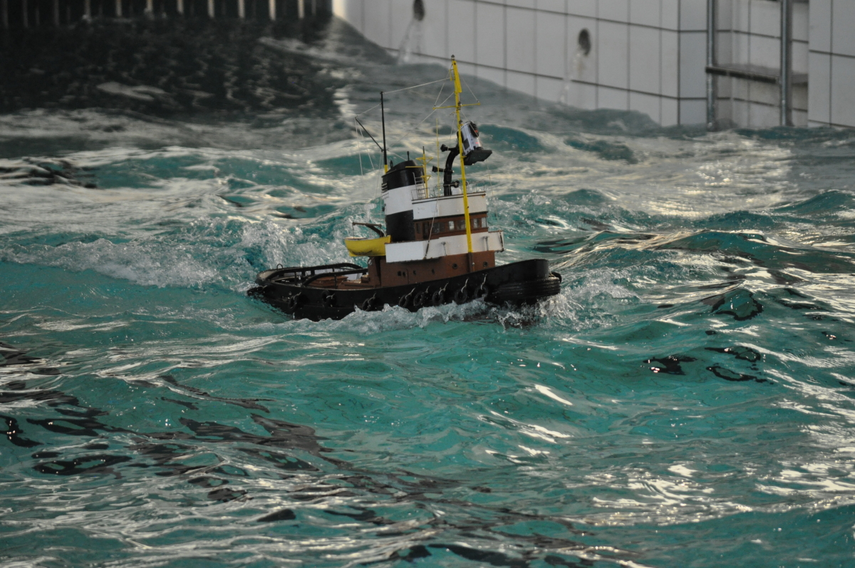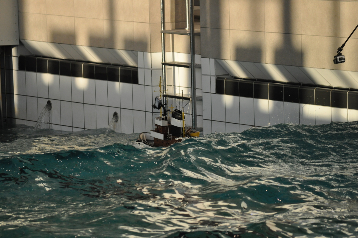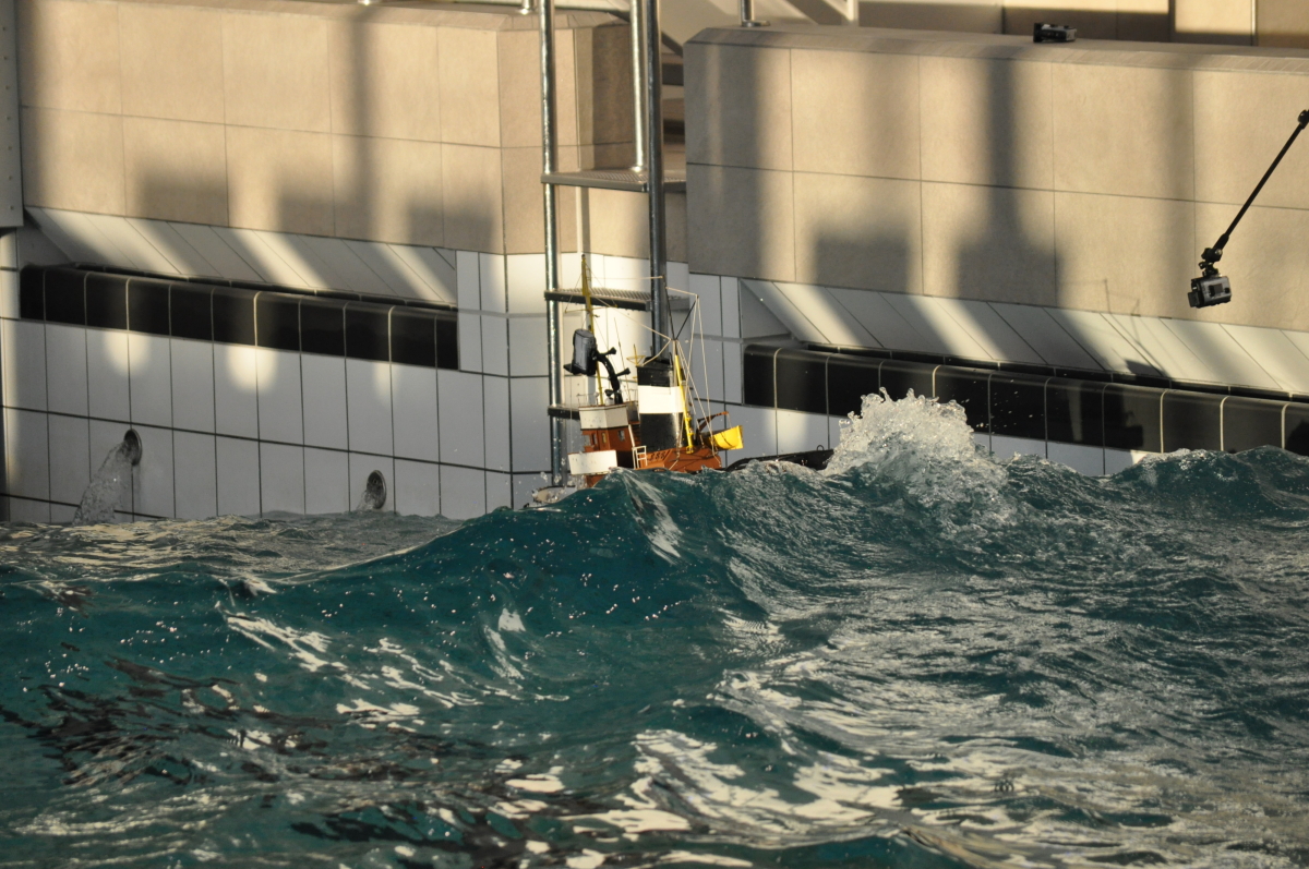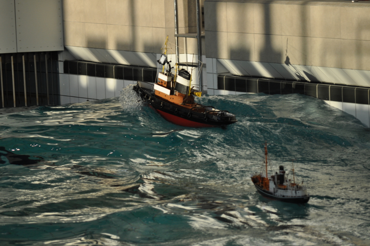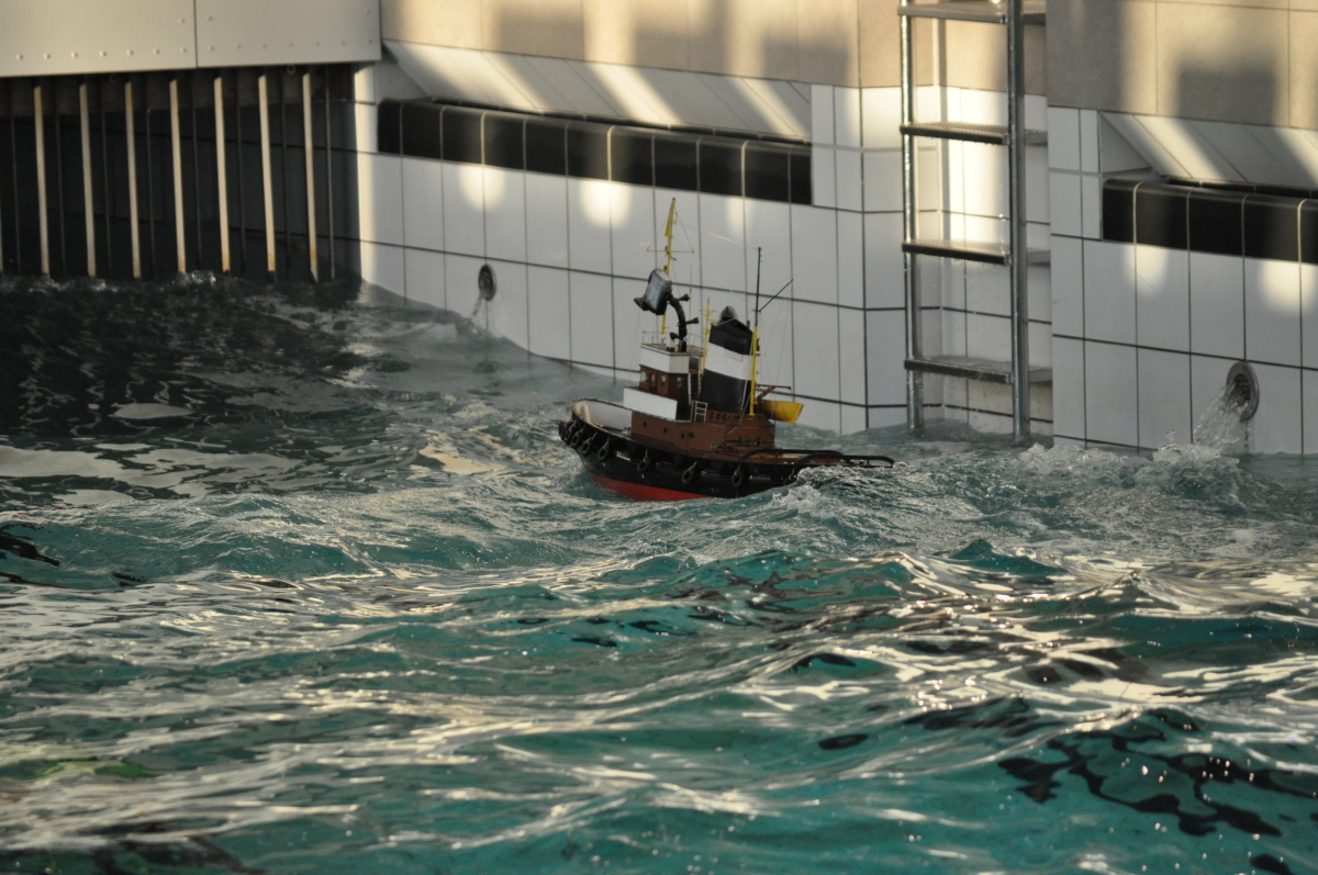 Zu jeder halben Stunde wurde im großen Meerwasserbecken die Wellenmaschine gestartet und das sonst ruhige Wasser wandelte sich binnen Sekunden zu schwerem Seegang. Unter den Augen zahlreicher begeisterter Zuschauer kämpften sich die Schiffsmodelle durch die auf den Maßstab gerechneten Monsterwellen. Dabei mussten die Kapitäne genau wissen, was sie ihren Modellen zumuten konnten. Würde man falsch navigieren, könnte das zum Kentern oder sogar zum Untergang des Schiffes führen. An diesem Tag allerdings lief alles glatt und kein Schiff kam durch die schwere See zu Schaden.
