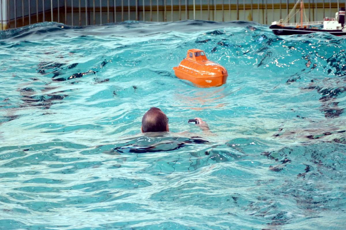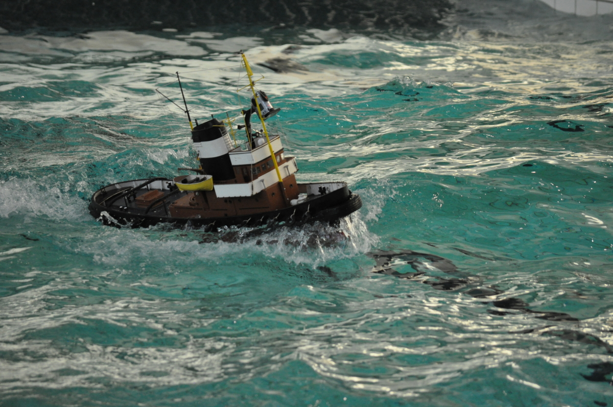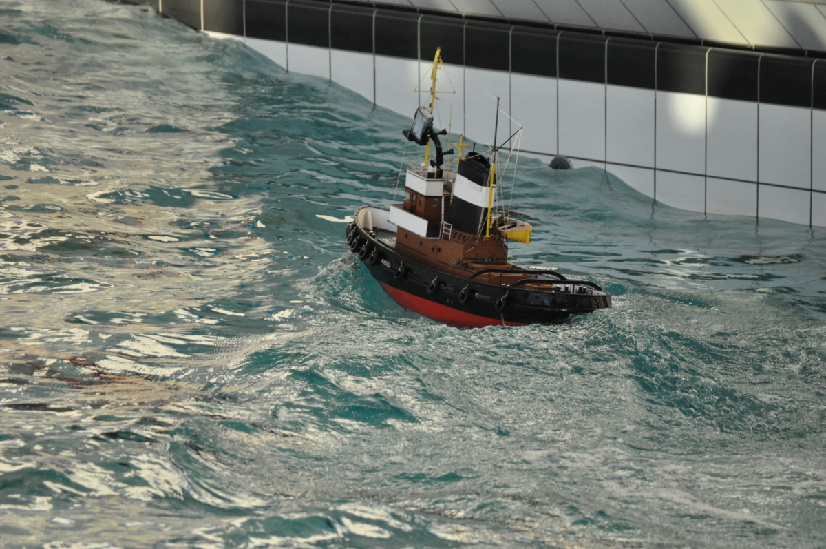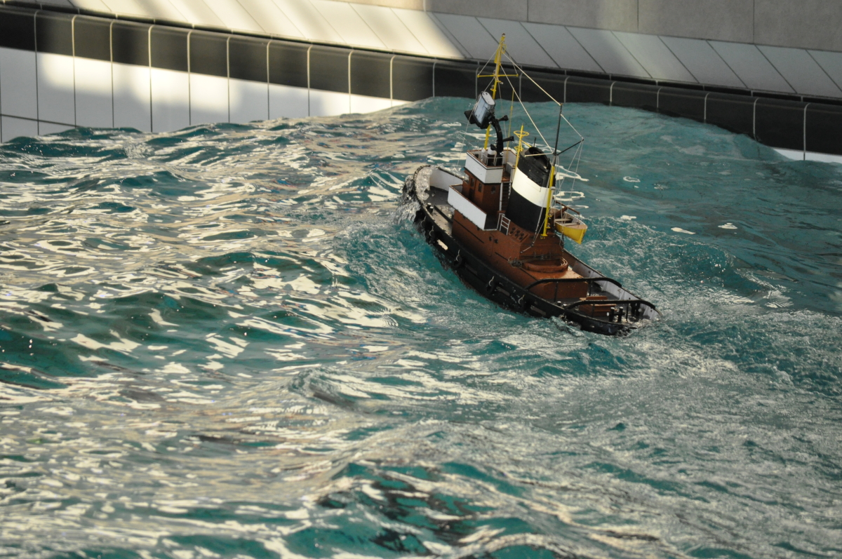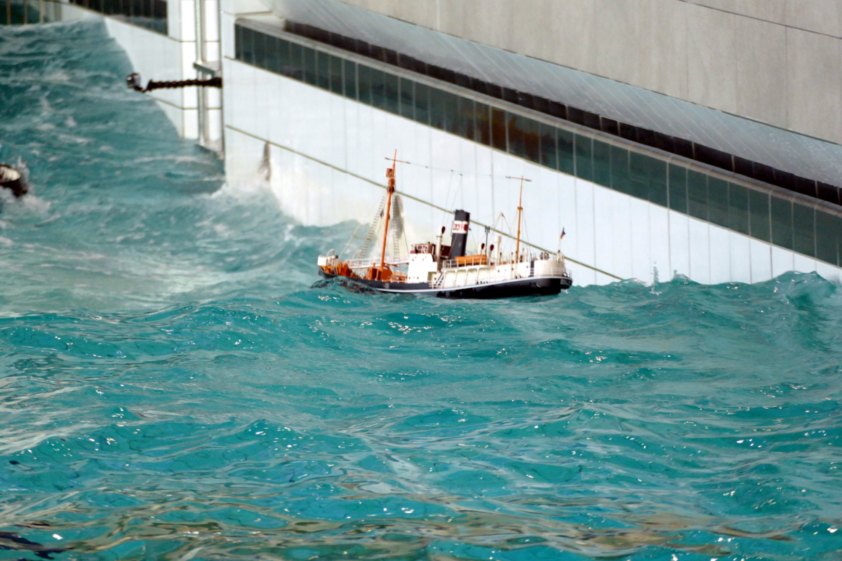 Zu jeder halben Stunde wurde im großen Meerwasserbecken die Wellenmaschine gestartet und das sonst ruhige Wasser wandelte sich binnen Sekunden zu schwerem Seegang. Unter den Augen zahlreicher begeisterter Zuschauer kämpften sich die Schiffsmodelle durch die auf den Maßstab gerechneten Monsterwellen. Dabei mussten die Kapitäne genau wissen, was sie ihren Modellen zumuten konnten. Würde man falsch navigieren, könnte das zum Kentern oder sogar zum Untergang des Schiffes führen. An diesem Tag allerdings lief alles glatt und kein Schiff kam durch die schwere See zu Schaden.