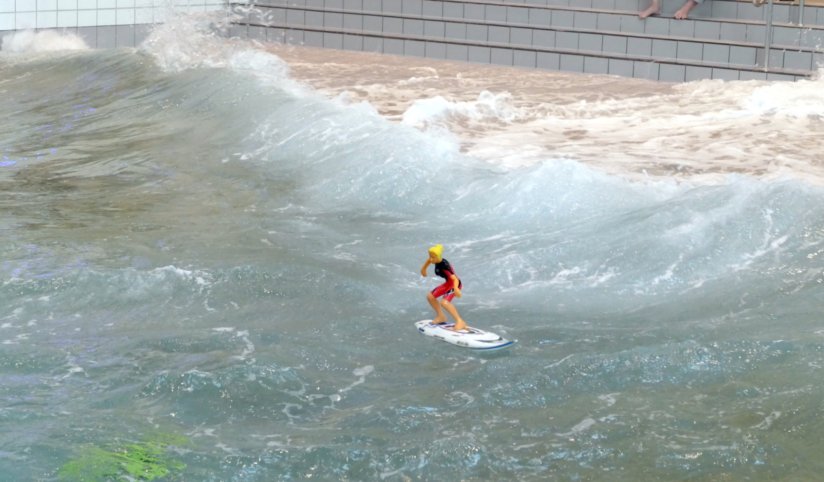 Wer sich nicht sicher war, ob sein Boot dem starken Wellengang gewachsen war, hatte natürlich auch die Möglichkeit, das Wellenbad immer dann zu nutzen, wenn die Wellenmaschine gerade Pause machte. Oder man wich einfach auf eines der kleineren Süßwasserbecken oder Whirlpools aus, die ebenfalls genutzt werden durften. Hier war es dann auch möglich, mit U-Booten seine Runden zu drehen. Überhaupt schien es, als wäre jeder Schiffstyp vertreten. Vom Büsumer Krabbenkutter über diverse U-Boote bis hin zum Schlachtschiff Scharnhorst ließ dieses top organisierte Event keine Wünsche offen. Selbst ein ferngesteuertes Surfbrett kreuzte mit seiner Surferin in der Brandung. Insgesamt waren an diesem Tag rund 160 Modelle vor Ort und die weiteste Anreise nahm ein Schiffsmodellbauer aus Köln auf sich. Auch Tauchlehrer Holger von „Subwaterfilms“ war wieder mit von der Partie und sorgte mit seinen Kameras auch bei starkem Wellengang für professionelle Über- und Unterwasseraufnahmen.