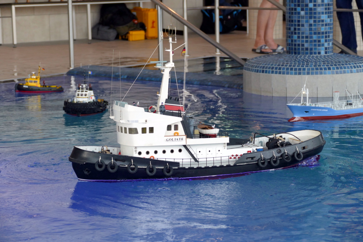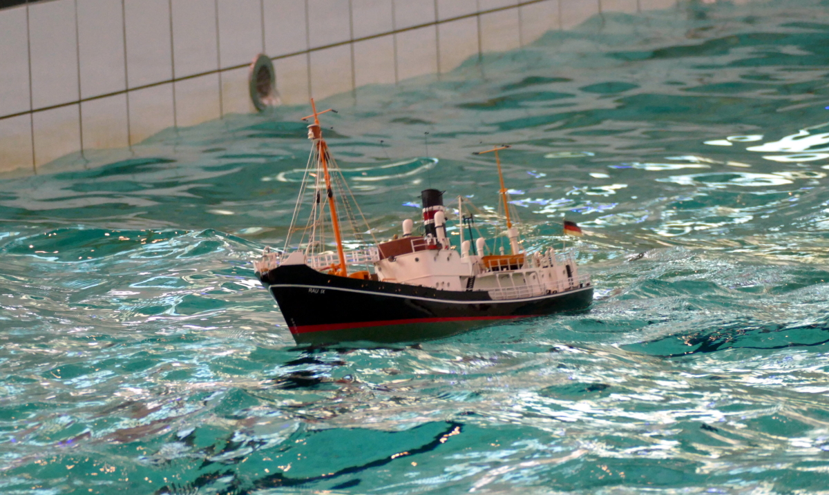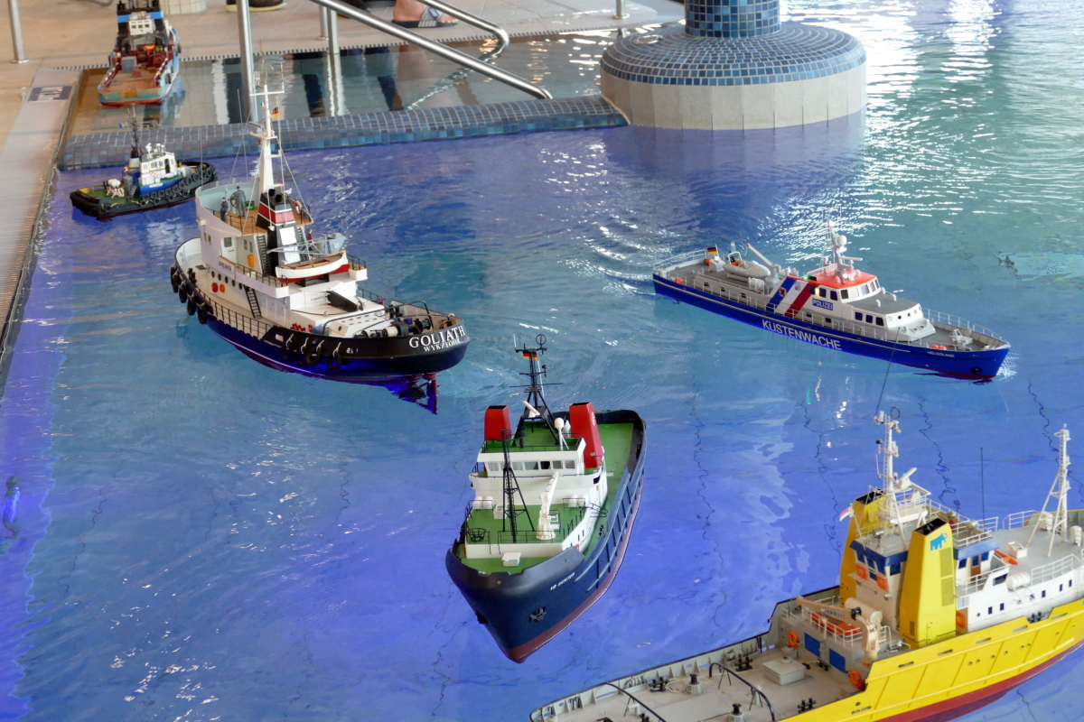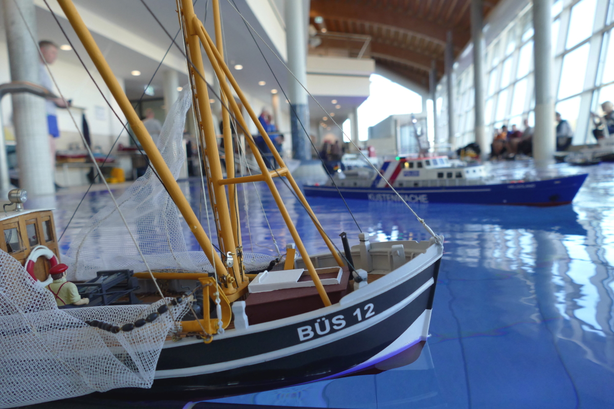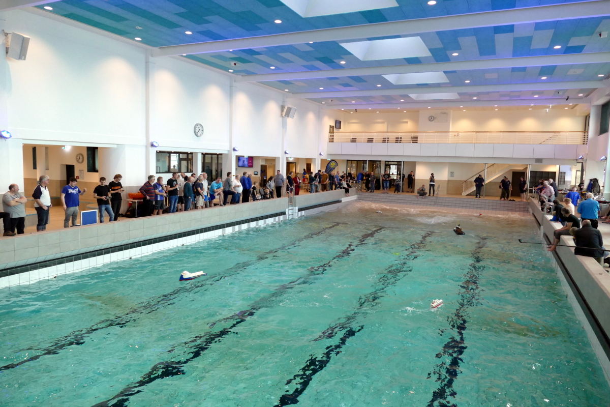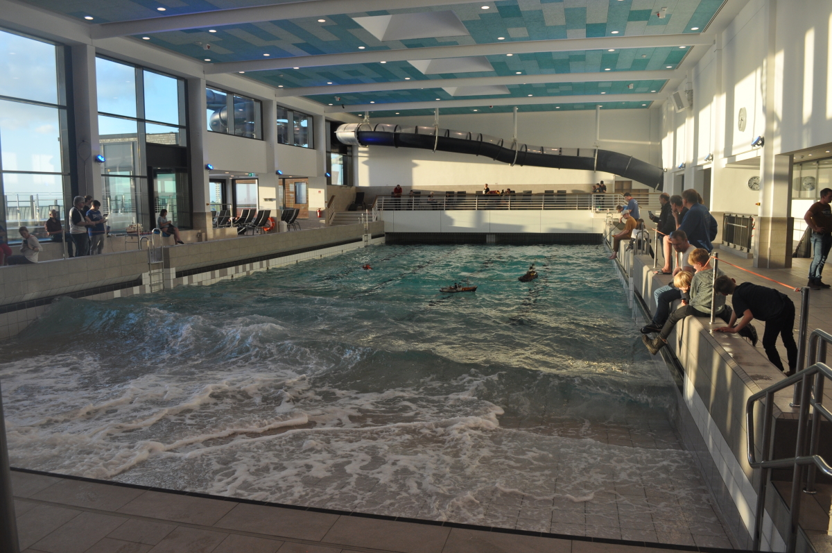 Am 8. Januar kamen bei bestem Wetter Modellbauer aus ganz Deutschland in die kleine Gemeinde an der Westküste des nördlichsten Bundeslandes. Ab 10 Uhr war das Event für die Aussteller geöffnet und ab 11 Uhr für Jedermann. Doch im Gegensatz zu den allermeisten Veranstaltungen, fand das beliebte Indoor-Schaufahren in einem Meerwasserwellenbad statt. Das „Meerzeit Wellenbad und Spa“ (www.buesum.de/meerzeit) stellte seine Räumlichkeiten dafür zur Verfügung. Nach einer freundlichen Begrüßungsrede der Bäderleitung Frau Herrmann an die versammelten Aussteller wurden die ersten Modelle zu Wasser gelassen.