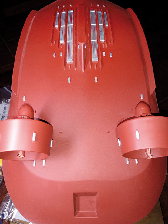 Die beiden Löschmonitore sind mit Hilfe der optionalen Wasserpumpe 7003/90 funktionsfähig und liegen dem Bausatz bei, ebenso die benötigten Kupplungen und Anschlüsse für die Schlauchführungen. Das Spantgerüst im Rumpf sieht den Einbau der Wasserpumpe bereits vor und die ausführlich gestaltete Bauanleitung zeigt genau deren Einbau und Anschluß.