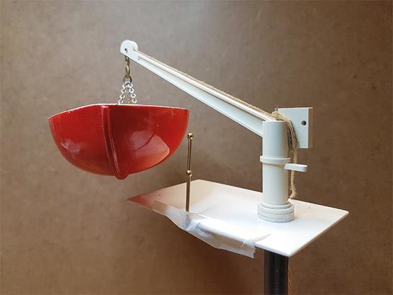 Die beiden Löschmonitore sind mit Hilfe der optionalen Wasserpumpe 7003/90 funktionsfähig und liegen dem Bausatz bei, ebenso die benötigten Kupplungen und Anschlüsse für die Schlauchführungen. Das Spantgerüst im Rumpf sieht den Einbau der Wasserpumpe bereits vor und die ausführlich gestaltete Bauanleitung zeigt genau deren Einbau und Anschluß.