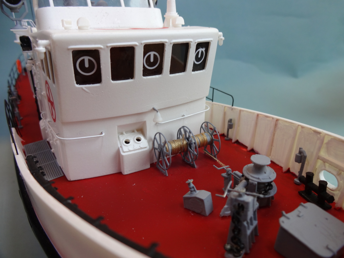 Der Beschlagteilesatz ist sehr umfangreich und besteht u.a. aus sämtlichen Lampenkörpern, Rettungsringen, Anker, Ankerwinde, funktionsfähige Beleuchtung wie Suchscheinwerfer, Blaulicht und nautische Beleuchtung, Antennen, motorbetriebenes Radar, zwei Löschmonitore mit Schlauchadapter, Signalhörner, Lautsprecher, eine große Anzahl hochwertiger 3D-Druckteile, Trittstufen, Reling, Fahrstandausbau, Poller, Klampen, Lichtmast mit Arbeitsscheinwerfer und einiges mehr. Der Beschlagteilesatz ist im Bausatz enthalten und muss nicht extra bestellt werden.