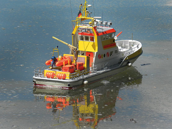 Das Boot kann voll funktionell ausgestattet werden. Alle Lampenkörper können mit LED bestückt werden, die Lackdrähte verschwinden komplett im Mast und Ausleger und werden zentral im Rumpf verschalten. Im Bausatz ist bereits ein Beleuchtungssatz für die nautische Beleuchtung, den Suchscheinwerfer und das Blaulicht enthalten. Der weitere Ausbau der Beleuchtung ist mit Hilfe des LED-Sets 5677/51 machbar.