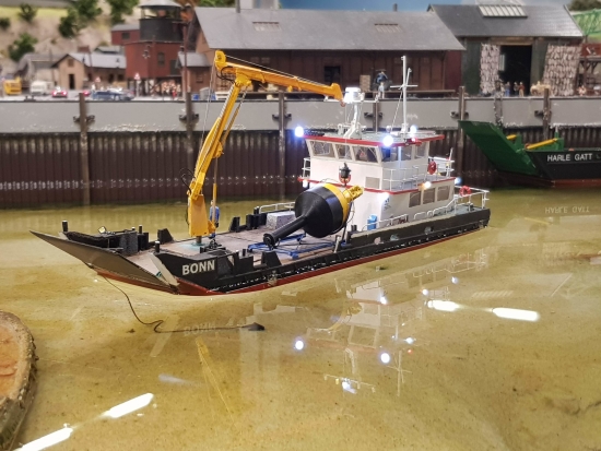 Das Boot kann voll funktionell ausgestattet werden. Alle Lampenkörper können mit LED bestückt werden, die Lackdrähte verschwinden komplett im Mast und Ausleger und werden zentral im Rumpf verschalten. Im Bausatz ist bereits ein Beleuchtungssatz für die nautische Beleuchtung, den Suchscheinwerfer und das Blaulicht enthalten. Der weitere Ausbau der Beleuchtung ist mit Hilfe des LED-Sets 5677/51 machbar.