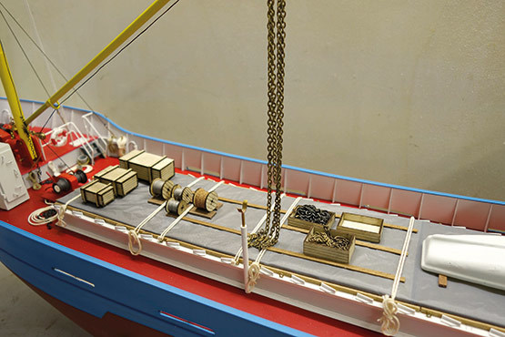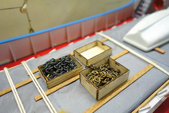 Der Beschlagteilesatz ist sehr umfangreich und besteht u.a. aus sämtlichen Lampenkörpern, Rettungsringen, Anker, Ankerwinde, funktionsfähige Beleuchtung wie Suchscheinwerfer, Blaulicht und nautische Beleuchtung, Antennen, motorbetriebenes Radar, zwei Löschmonitore mit Schlauchadapter, Signalhörner, Lautsprecher, eine große Anzahl hochwertiger 3D-Druckteile, Trittstufen, Reling, Fahrstandausbau, Poller, Klampen, Lichtmast mit Arbeitsscheinwerfer und einiges mehr. Der Beschlagteilesatz ist im Bausatz enthalten und muss nicht extra bestellt werden.