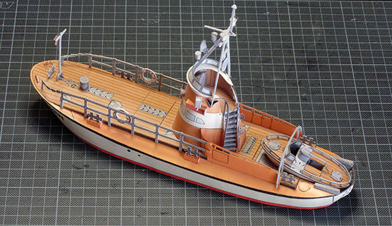 Das Boot kann voll funktionell ausgestattet werden. Alle Lampenkörper können mit LED bestückt werden, die Lackdrähte verschwinden komplett im Mast und Ausleger und werden zentral im Rumpf verschalten. Im Bausatz ist bereits ein Beleuchtungssatz für die nautische Beleuchtung, den Suchscheinwerfer und das Blaulicht enthalten. Der weitere Ausbau der Beleuchtung ist mit Hilfe des LED-Sets 5677/51 machbar.