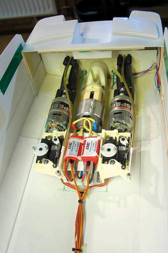 Die beiden Löschmonitore sind mit Hilfe der optionalen Wasserpumpe 7003/90 funktionsfähig und liegen dem Bausatz bei, ebenso die benötigten Kupplungen und Anschlüsse für die Schlauchführungen. Das Spantgerüst im Rumpf sieht den Einbau der Wasserpumpe bereits vor und die ausführlich gestaltete Bauanleitung zeigt genau deren Einbau und Anschluß.