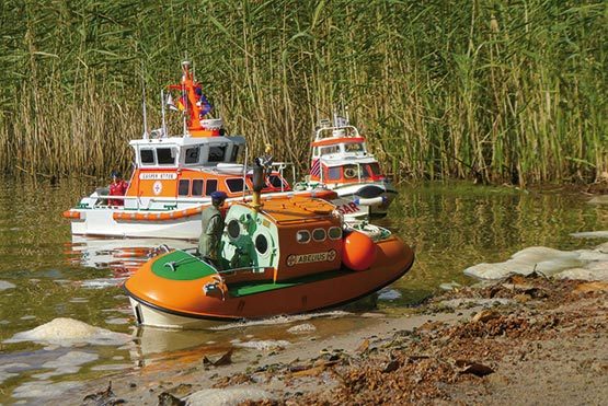 Das Boot kann voll funktionell ausgestattet werden. Alle Lampenkörper können mit LED bestückt werden, die Lackdrähte verschwinden komplett im Mast und Ausleger und werden zentral im Rumpf verschalten. Im Bausatz ist bereits ein Beleuchtungssatz für die nautische Beleuchtung, den Suchscheinwerfer und das Blaulicht enthalten. Der weitere Ausbau der Beleuchtung ist mit Hilfe des LED-Sets 5677/51 machbar.