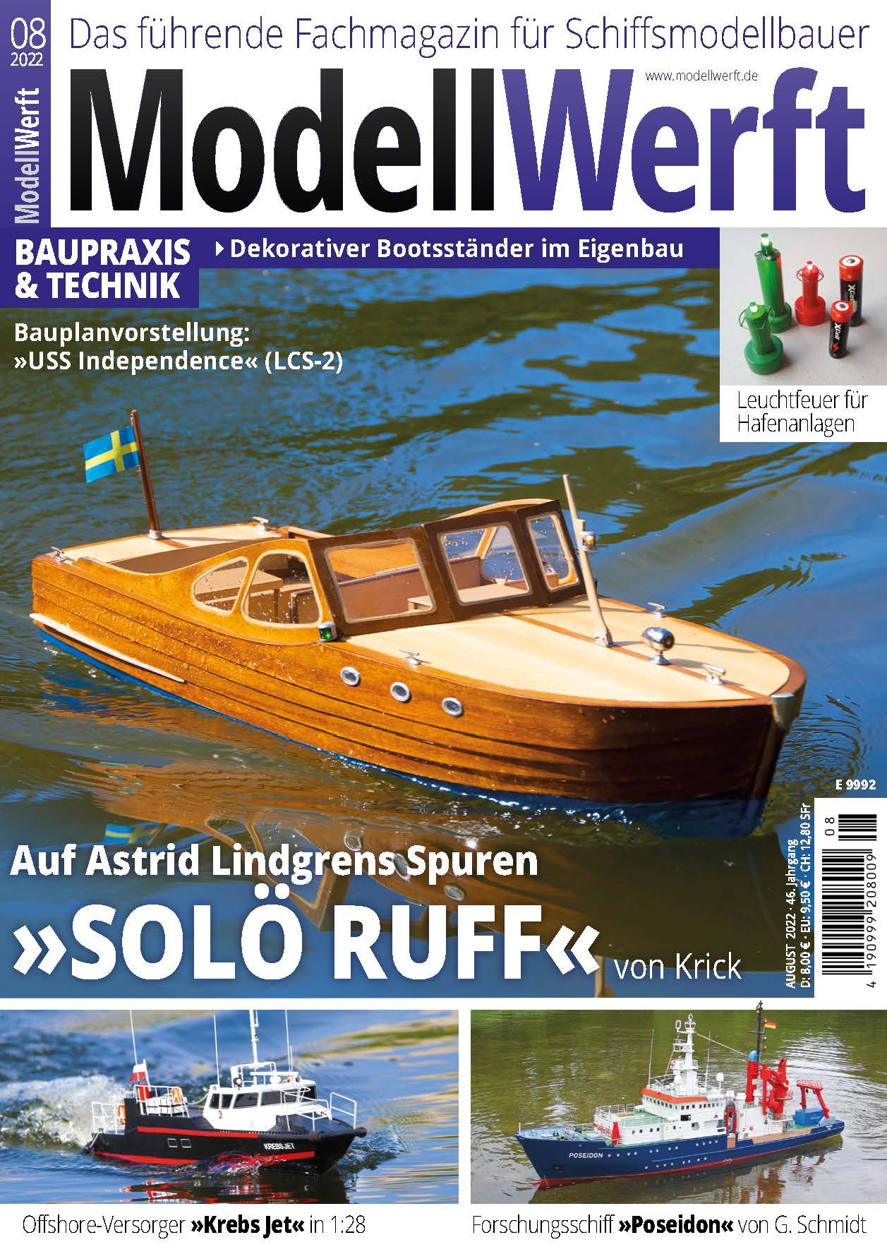 Wenn man an traditionelle Motorboote in Holzbauweise denkt, hat man häufig zunächst direkt die edlen italienischen Mahagoni-Boote der 50er- und 60er-Jahre vor Augen. Doch nicht nur die Italiener haben zu dieser Zeit solche Schönheiten gebaut, auch Mahagoni-Boote aus Schweden konnten sich mehr als nur sehen lassen. Eine der bekanntesten Vertreterinnen dieser Zeit ist die Solö Ruff der schwedischen Storebro-Werft, die in den 50er- und 60er-Jahren in größeren Stückzahlen gebaut wurde und nicht nur in Schweden viele Anhänger fand. Unter den Liebhabern dieser feinen Boote finden sich auch prominente Namen wie etwa Astrid Lindgren, die gerne und häufig mit ihrer Solö in den schwedischen Schären unterwegs war. Heute sind die aus honduranischem Mahagoni gebauten Boote exklusive Klassiker und – ebenso wie die italienischen Boote – heiß begehrt. Das wunderschöne Modell der Solö Ruff, das den Titel der MODELLWERFT-Ausgabe 08/2022 ziert, ist bei Krick Modelltechnik erhältlich und eigentlich gar nicht für den Einsatz im Wasser, sondern vielmehr für die Vitrine vorgesehen. Schon beim Betrachten des Bausatzes stand für MODELLWERFT-Autor Manfred Kaiser-Pletscher aber fest, dass er dieses Boot mit einer RC-Steuerung ausstatten, um es auf dem Wasser schippern zu lassen. Sein ausführlicher Baubericht macht Lust auf klassischen Modellbau, regt dazu an, sich mit der Geschichte des schwedischen Bootsbaus zu beschäftigten und entführt den Leser in die Lebzeiten der wohl berühmtesten Kinderbuchautorin der Welt. Zusätzlich wird in der MODELLWERFT 08/2022 das US-Kampfschiff USS Independence ausführlich vorgestellt. Der Bauplan im Maßstab 1:100 ist ab sofort exklusiv im VTH-Shop erhältlich.