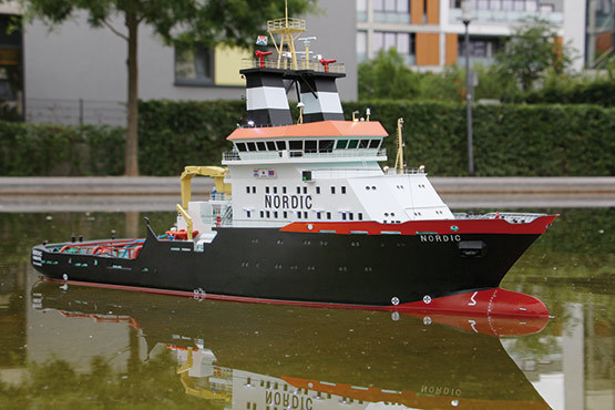 Das FLB-12 ist ein Feuerlöschboot, wie es auf deutschen Binnengewässern zum Einsatz kommt. Es wurde Originalbooten nachempfunden und besticht durch einen sehr hohen Detaillierungsgrad. Angetrieben wird das Modell von einem 28-mm-Außenläufer-Motor.