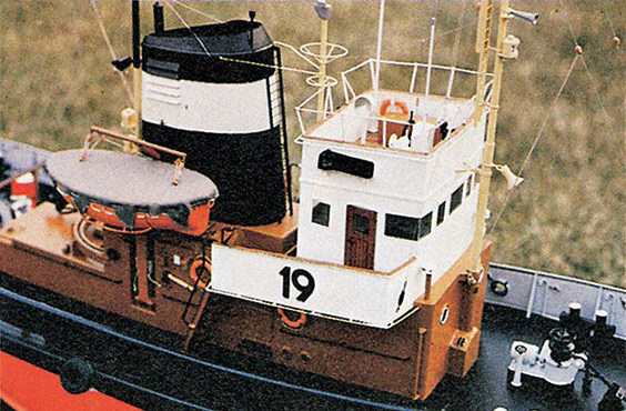 Die beiden Löschmonitore sind mit Hilfe der optionalen Wasserpumpe 7003/90 funktionsfähig und liegen dem Bausatz bei, ebenso die benötigten Kupplungen und Anschlüsse für die Schlauchführungen. Das Spantgerüst im Rumpf sieht den Einbau der Wasserpumpe bereits vor und die ausführlich gestaltete Bauanleitung zeigt genau deren Einbau und Anschluß.