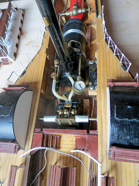 Die beiden Löschmonitore sind mit Hilfe der optionalen Wasserpumpe 7003/90 funktionsfähig und liegen dem Bausatz bei, ebenso die benötigten Kupplungen und Anschlüsse für die Schlauchführungen. Das Spantgerüst im Rumpf sieht den Einbau der Wasserpumpe bereits vor und die ausführlich gestaltete Bauanleitung zeigt genau deren Einbau und Anschluß.