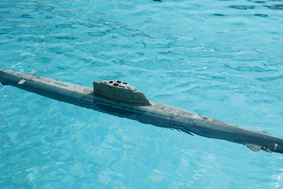 Die beiden Löschmonitore sind mit Hilfe der optionalen Wasserpumpe 7003/90 funktionsfähig und liegen dem Bausatz bei, ebenso die benötigten Kupplungen und Anschlüsse für die Schlauchführungen. Das Spantgerüst im Rumpf sieht den Einbau der Wasserpumpe bereits vor und die ausführlich gestaltete Bauanleitung zeigt genau deren Einbau und Anschluß.