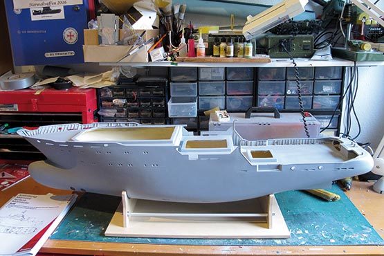 Der Beschlagteilesatz ist sehr umfangreich und besteht u.a. aus sämtlichen Lampenkörpern, Rettungsringen, Anker, Ankerwinde, funktionsfähige Beleuchtung wie Suchscheinwerfer, Blaulicht und nautische Beleuchtung, Antennen, motorbetriebenes Radar, zwei Löschmonitore mit Schlauchadapter, Signalhörner, Lautsprecher, eine große Anzahl hochwertiger 3D-Druckteile, Trittstufen, Reling, Fahrstandausbau, Poller, Klampen, Lichtmast mit Arbeitsscheinwerfer und einiges mehr. Der Beschlagteilesatz ist im Bausatz enthalten und muss nicht extra bestellt werden.