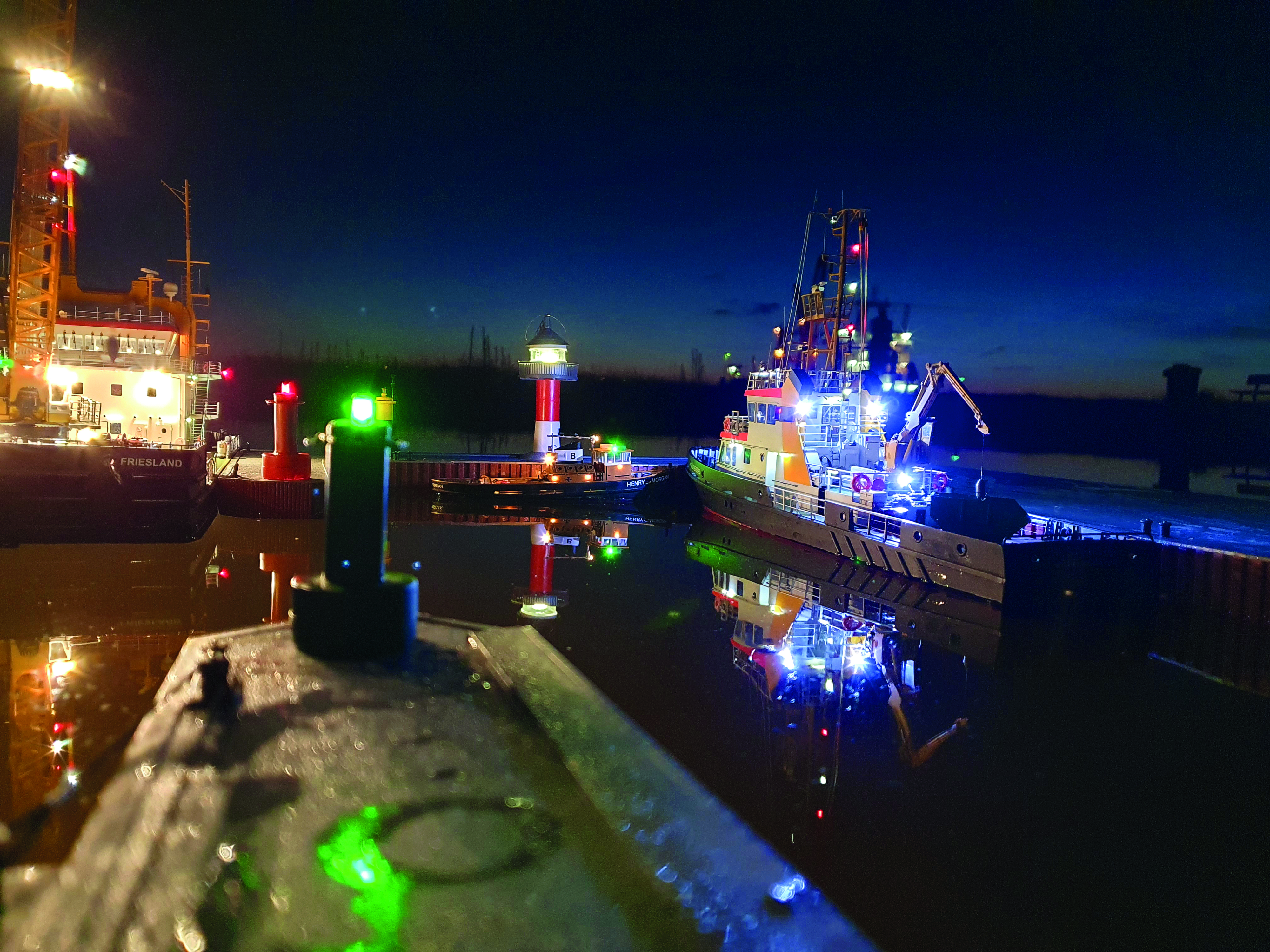 Das Boot kann voll funktionell ausgestattet werden. Alle Lampenkörper können mit LED bestückt werden, die Lackdrähte verschwinden komplett im Mast und Ausleger und werden zentral im Rumpf verschalten. Im Bausatz ist bereits ein Beleuchtungssatz für die nautische Beleuchtung, den Suchscheinwerfer und das Blaulicht enthalten. Der weitere Ausbau der Beleuchtung ist mit Hilfe des LED-Sets 5677/51 machbar.