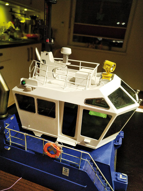 Das Boot kann voll funktionell ausgestattet werden. Alle Lampenkörper können mit LED bestückt werden, die Lackdrähte verschwinden komplett im Mast und Ausleger und werden zentral im Rumpf verschalten. Im Bausatz ist bereits ein Beleuchtungssatz für die nautische Beleuchtung, den Suchscheinwerfer und das Blaulicht enthalten. Der weitere Ausbau der Beleuchtung ist mit Hilfe des LED-Sets 5677/51 machbar.