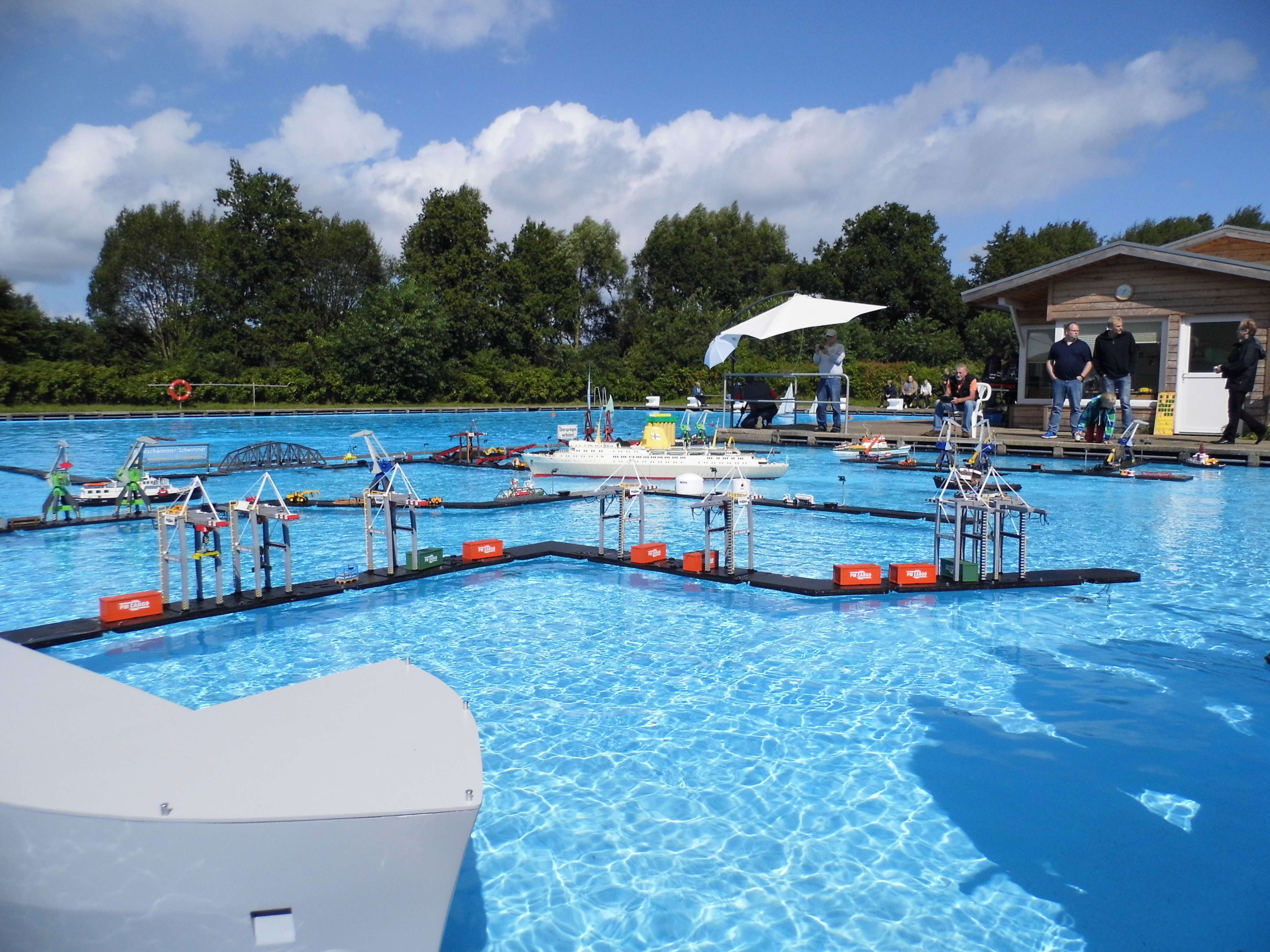Da das Freibad nicht städtisch ist, sondern durch einen Förderverein betrieben wird, helfen die Stör-Piraten bei der jährlichen Pflege und dem Winterfestmachen der Anlagen mit. Dafür werden sie dann vom Förderverein jedes Jahr aufs Neue gebeten, ihre Veranstaltung auf dem Gelände des Freibades abzuhalten. Eine gute Lösung wie man seit 2012 sieht. Das Bad strahlt und wir haben eine Top-Anlage zum Fahren. Die Stör-Piraten können uns dadurch sogar Strom bis an Zelte und Wohnwagen legen. So lässt sich nachts der Akku wieder laden, um am nächsten Tag wieder fahrbereit zu sein. Und Akkus braucht man hier viele, denn die wenigsten Modelle stehen auf den Tischen. Es ist ein stetiges Treiben über Tag und am Abend im Hafen, wie ich es so sonst nur aus Süddeutschland von einer anderen Veranstaltung her kenne.