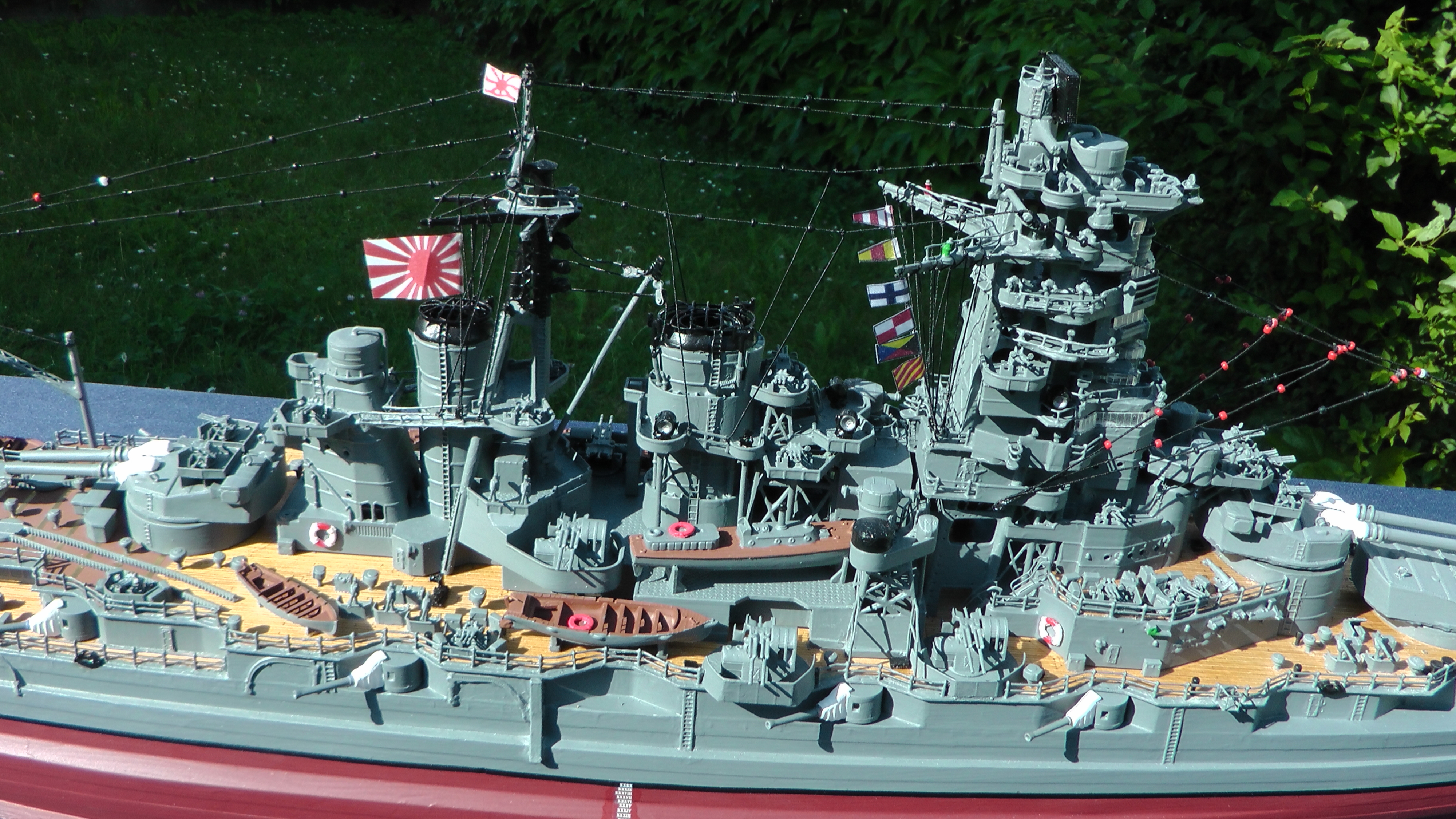 Die beiden Löschmonitore sind mit Hilfe der optionalen Wasserpumpe 7003/90 funktionsfähig und liegen dem Bausatz bei, ebenso die benötigten Kupplungen und Anschlüsse für die Schlauchführungen. Das Spantgerüst im Rumpf sieht den Einbau der Wasserpumpe bereits vor und die ausführlich gestaltete Bauanleitung zeigt genau deren Einbau und Anschluß.