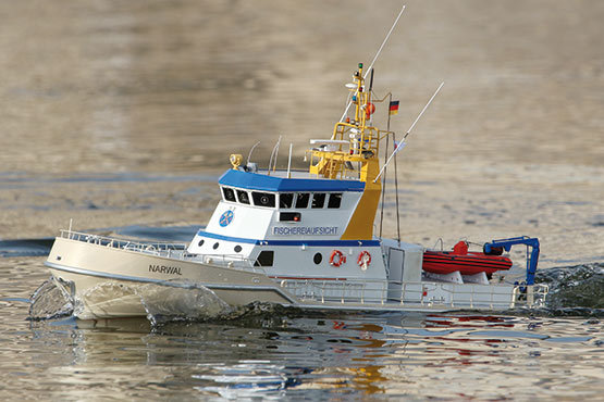 Das Boot kann voll funktionell ausgestattet werden. Alle Lampenkörper können mit LED bestückt werden, die Lackdrähte verschwinden komplett im Mast und Ausleger und werden zentral im Rumpf verschalten. Im Bausatz ist bereits ein Beleuchtungssatz für die nautische Beleuchtung, den Suchscheinwerfer und das Blaulicht enthalten. Der weitere Ausbau der Beleuchtung ist mit Hilfe des LED-Sets 5677/51 machbar.
