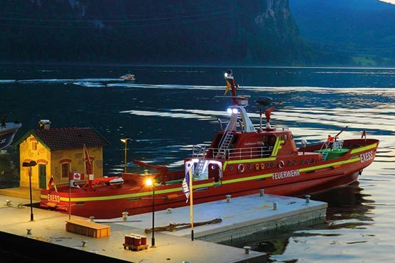 Das Boot kann voll funktionell ausgestattet werden. Alle Lampenkörper können mit LED bestückt werden, die Lackdrähte verschwinden komplett im Mast und Ausleger und werden zentral im Rumpf verschalten. Im Bausatz ist bereits ein Beleuchtungssatz für die nautische Beleuchtung, den Suchscheinwerfer und das Blaulicht enthalten. Der weitere Ausbau der Beleuchtung ist mit Hilfe des LED-Sets 5677/51 machbar.