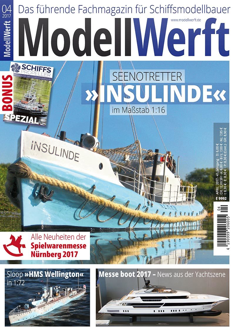 Unser Titelmodell ist diesmal der niederländische Seenotretter-Klassiker Insulinde im beeindruckenden Maßstab 1:16 von Christian König. Weiterhin testet Roman Graf für uns das neue Formel-1-Rennboot Caudwell F1 von Staufenbiel, Thorsten Momber erläutert den Eigenbau eines Arbeitsscheinwerfers auf LED-Basis und Andreas Stach hat sich in der Yachtszene auf der diesjährigen boot in Düsseldorf umgesehen. Diese und viele weitere Themen gibt es in der MODELLWERFT 04/2017 – ab sofort digital erhältlich und ab 15.03.2017 im Zeitschriftenhandel.