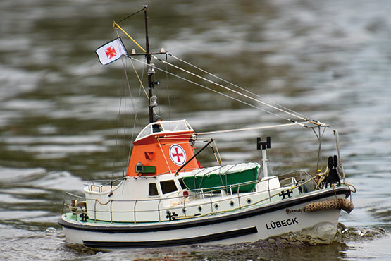 Das Boot kann voll funktionell ausgestattet werden. Alle Lampenkörper können mit LED bestückt werden, die Lackdrähte verschwinden komplett im Mast und Ausleger und werden zentral im Rumpf verschalten. Im Bausatz ist bereits ein Beleuchtungssatz für die nautische Beleuchtung, den Suchscheinwerfer und das Blaulicht enthalten. Der weitere Ausbau der Beleuchtung ist mit Hilfe des LED-Sets 5677/51 machbar.