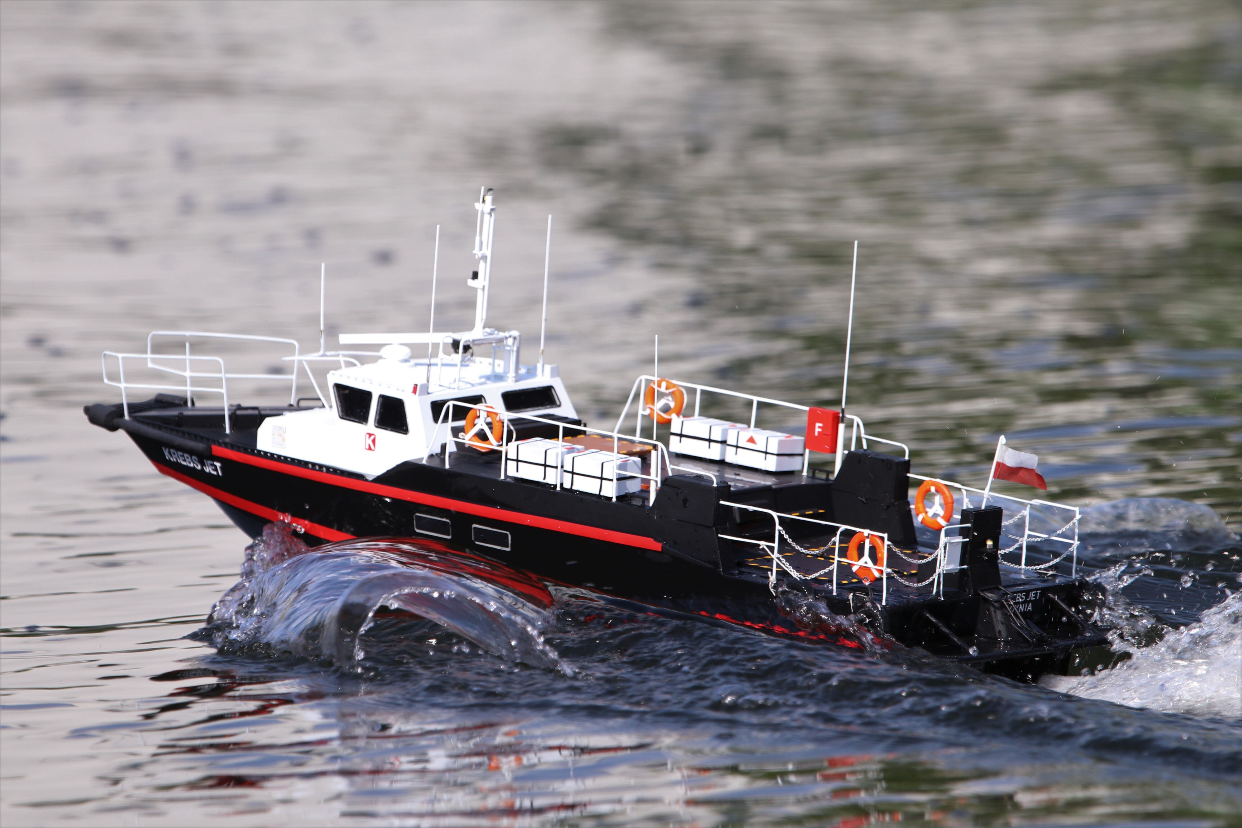 Das FLB-12 ist ein Feuerlöschboot, wie es auf deutschen Binnengewässern zum Einsatz kommt. Es wurde Originalbooten nachempfunden und besticht durch einen sehr hohen Detaillierungsgrad. Angetrieben wird das Modell von einem 28-mm-Außenläufer-Motor.