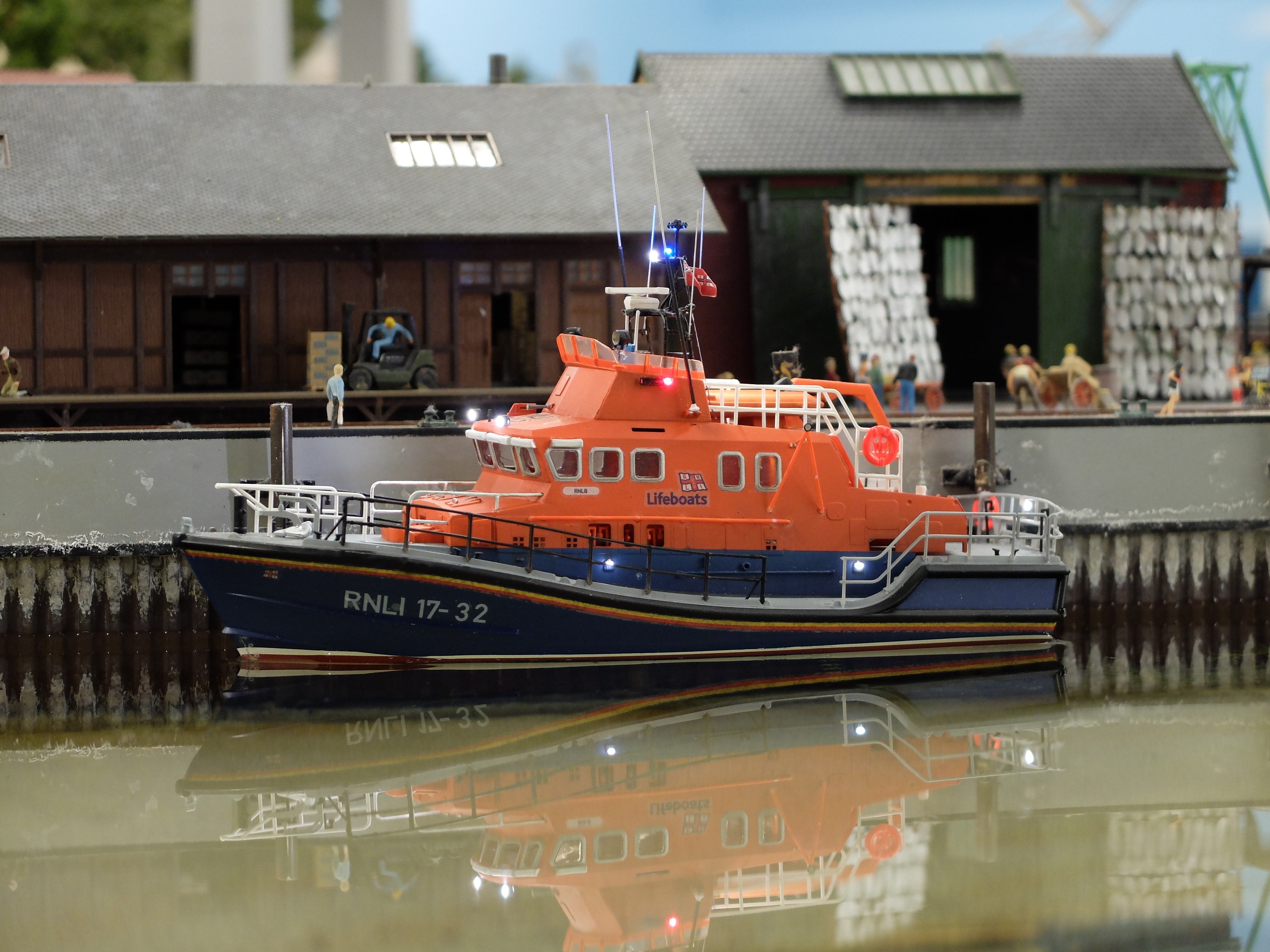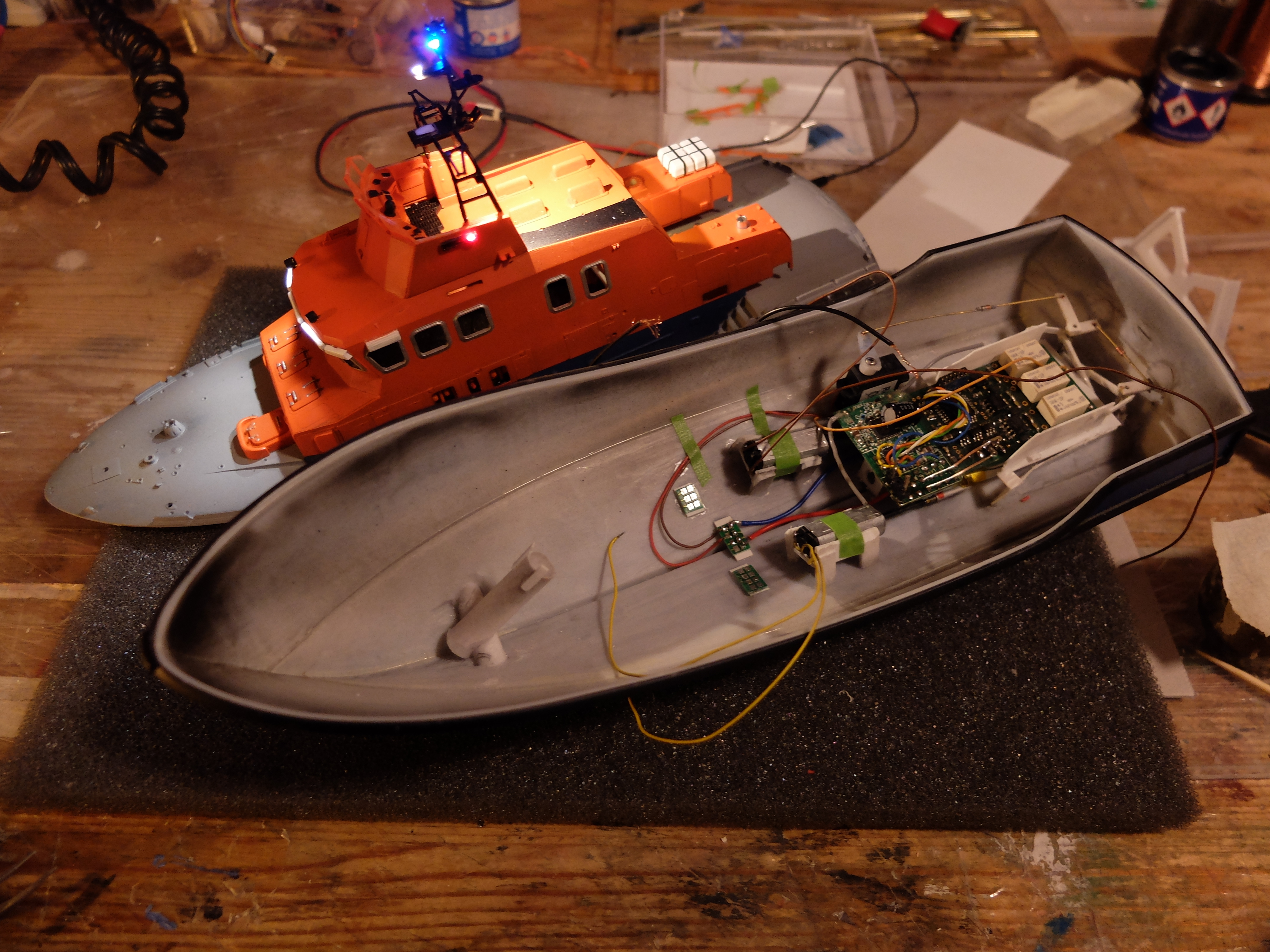 Das Boot kann voll funktionell ausgestattet werden. Alle Lampenkörper können mit LED bestückt werden, die Lackdrähte verschwinden komplett im Mast und Ausleger und werden zentral im Rumpf verschalten. Im Bausatz ist bereits ein Beleuchtungssatz für die nautische Beleuchtung, den Suchscheinwerfer und das Blaulicht enthalten. Der weitere Ausbau der Beleuchtung ist mit Hilfe des LED-Sets 5677/51 machbar.