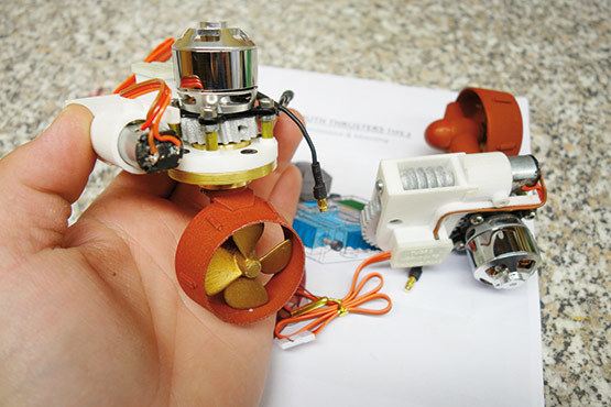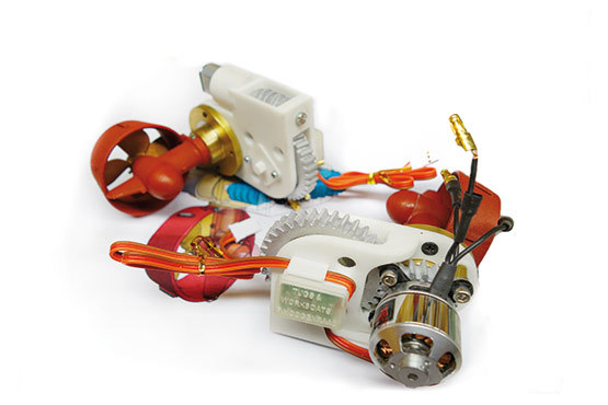 Die beiden Löschmonitore sind mit Hilfe der optionalen Wasserpumpe 7003/90 funktionsfähig und liegen dem Bausatz bei, ebenso die benötigten Kupplungen und Anschlüsse für die Schlauchführungen. Das Spantgerüst im Rumpf sieht den Einbau der Wasserpumpe bereits vor und die ausführlich gestaltete Bauanleitung zeigt genau deren Einbau und Anschluß.