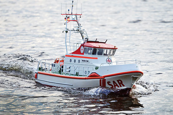 Das Boot kann voll funktionell ausgestattet werden. Alle Lampenkörper können mit LED bestückt werden, die Lackdrähte verschwinden komplett im Mast und Ausleger und werden zentral im Rumpf verschalten. Im Bausatz ist bereits ein Beleuchtungssatz für die nautische Beleuchtung, den Suchscheinwerfer und das Blaulicht enthalten. Der weitere Ausbau der Beleuchtung ist mit Hilfe des LED-Sets 5677/51 machbar.