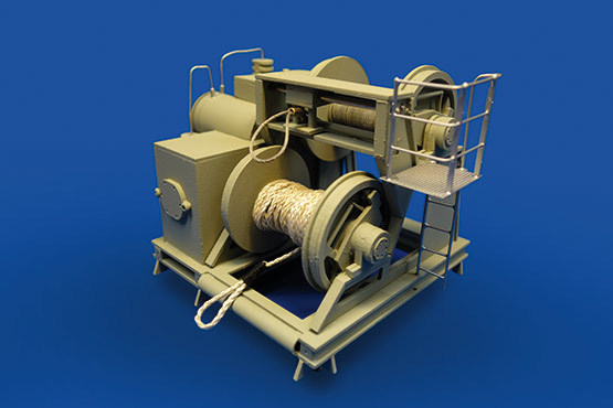 Der Beschlagteilesatz ist sehr umfangreich und besteht u.a. aus sämtlichen Lampenkörpern, Rettungsringen, Anker, Ankerwinde, funktionsfähige Beleuchtung wie Suchscheinwerfer, Blaulicht und nautische Beleuchtung, Antennen, motorbetriebenes Radar, zwei Löschmonitore mit Schlauchadapter, Signalhörner, Lautsprecher, eine große Anzahl hochwertiger 3D-Druckteile, Trittstufen, Reling, Fahrstandausbau, Poller, Klampen, Lichtmast mit Arbeitsscheinwerfer und einiges mehr. Der Beschlagteilesatz ist im Bausatz enthalten und muss nicht extra bestellt werden.