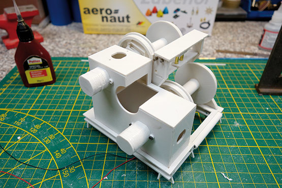 Die beiden Löschmonitore sind mit Hilfe der optionalen Wasserpumpe 7003/90 funktionsfähig und liegen dem Bausatz bei, ebenso die benötigten Kupplungen und Anschlüsse für die Schlauchführungen. Das Spantgerüst im Rumpf sieht den Einbau der Wasserpumpe bereits vor und die ausführlich gestaltete Bauanleitung zeigt genau deren Einbau und Anschluß.
