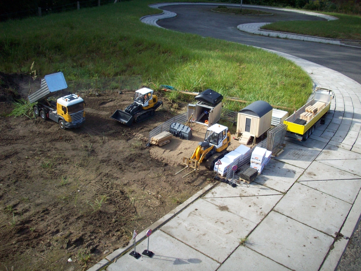 Die Baumaschinen wurden gestartet und man begann mit der Arbeit. Ich habe am Morgen insgesamt 22 Modellbauer gezählt und es waren über 40 Modelle zu sehen. Alles was für eine Baustelle wichtig ist und auch gewünscht wurde, war zu sehen. Eine entsprechende Beschilderung, Bauzäune, große und kleine Radlader, Bauwagen, Lichtgiraffen, große und kleine Raupen, funktionsfähige Vibratioinsanhängerwalzen, eine reichhaltige Vielfalt von Kippfahrzeugen, „2 achsige Oldtimer-Solokipper“, Allrad-angetriebene Gliederzüge, sowie Kippauflieger, aber auch Dumper.